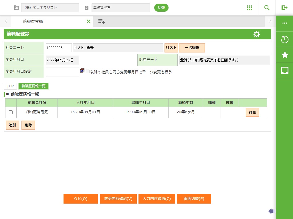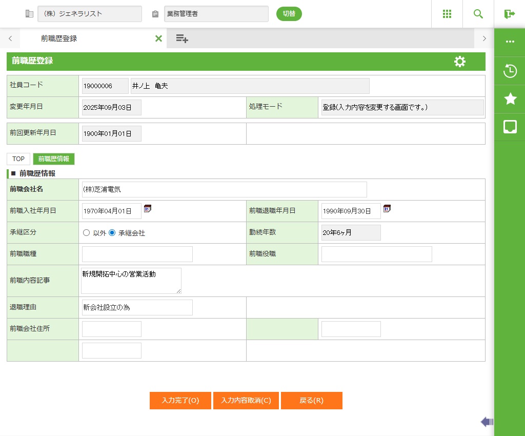 前職歴情報を新規登録します。詳細画面が表示されます。 |