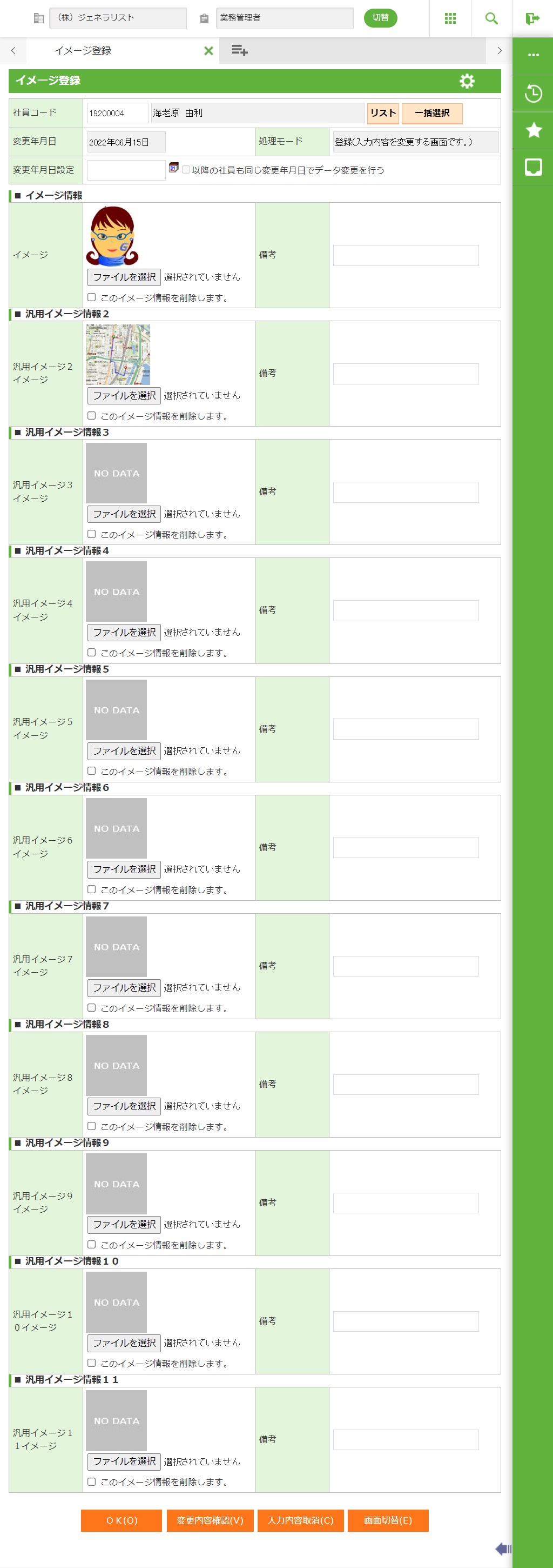 イメージファイル(イメージ情報/汎用イメージ情報2〜11)を1社員毎確認して登録が行えます。