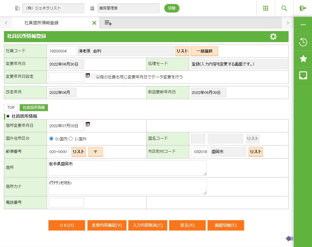社員選択で入力した社員の社員居所情報を修正します。修正画面を表示します。 |