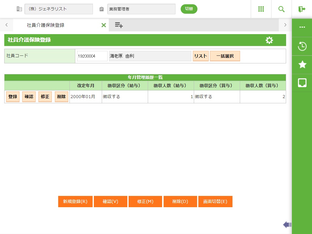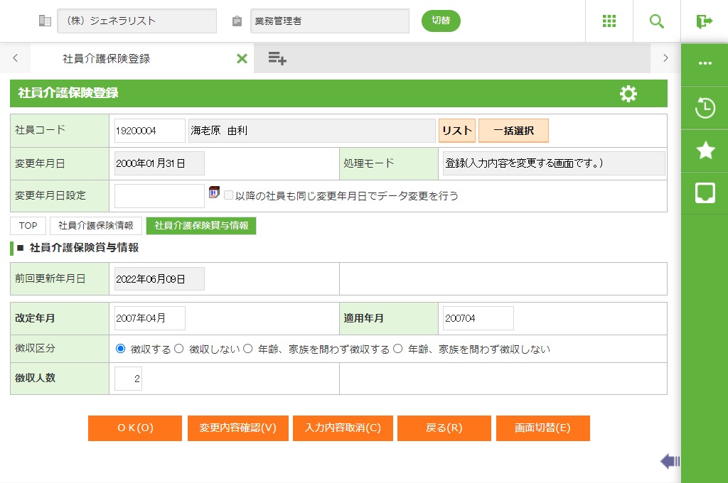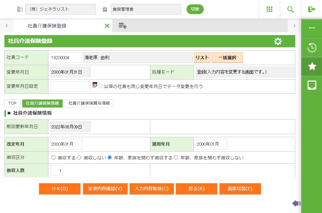 社員選択で入力した社員の社員介護保険情報を確認します。確認画面が表示されます。 |