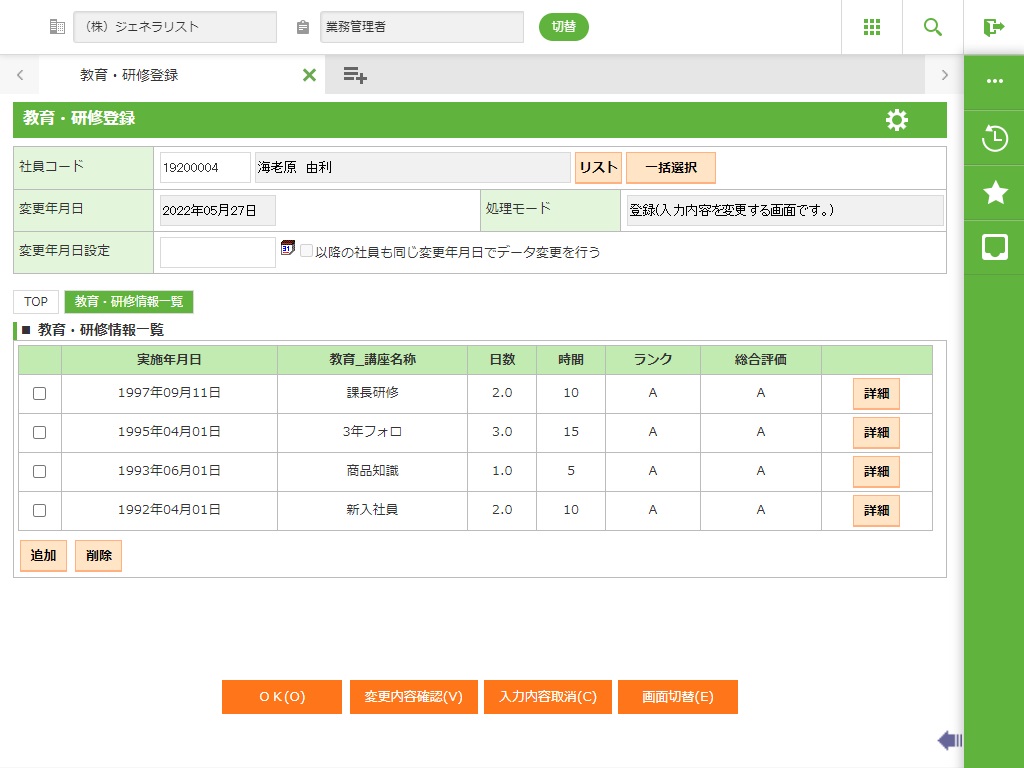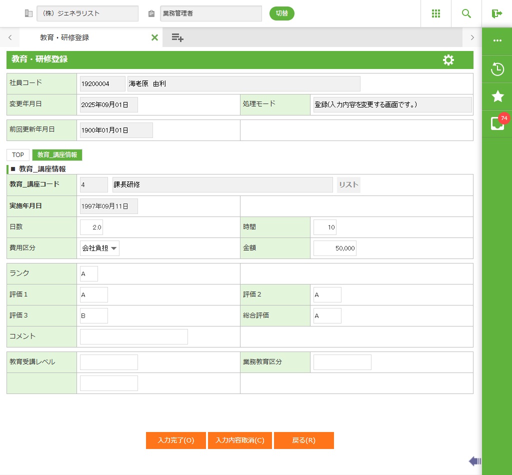 社員が受講した教育研修の履歴と評価結果などを登録します。