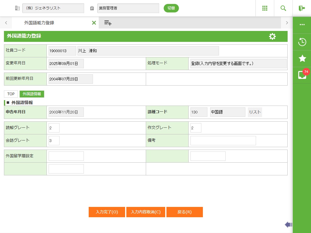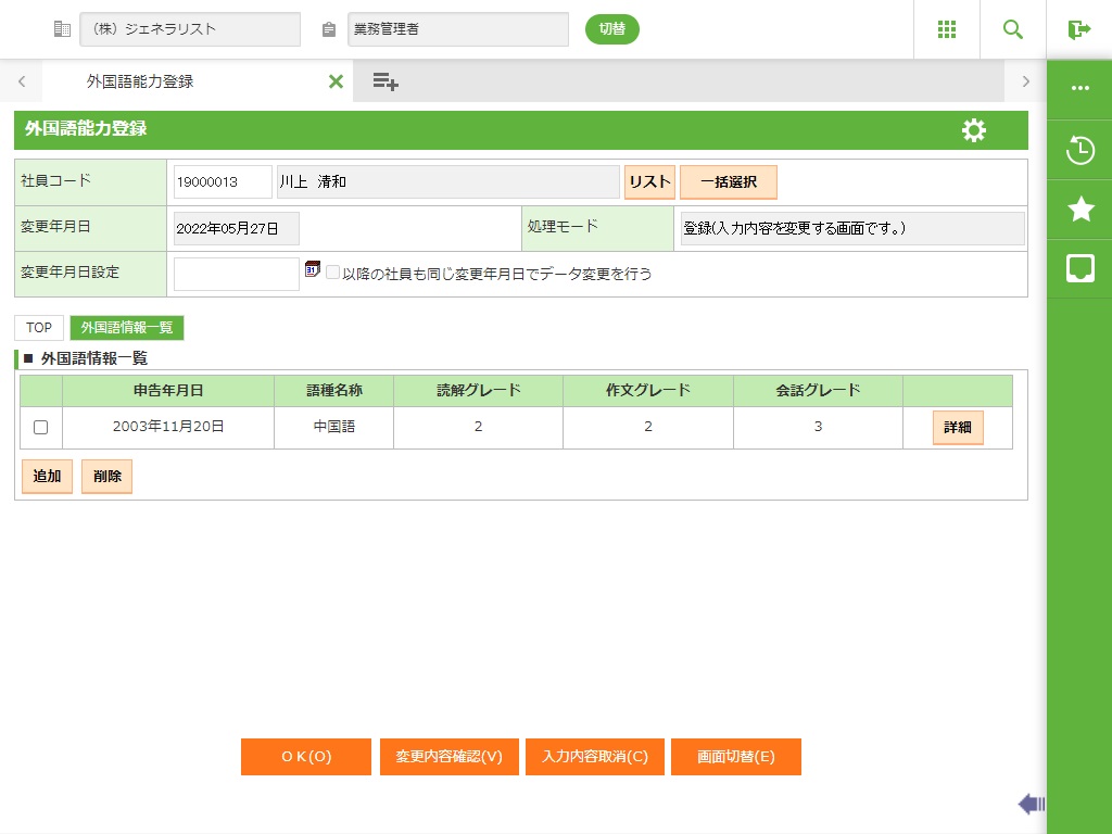 社員の外国語能力の情報を登録します。