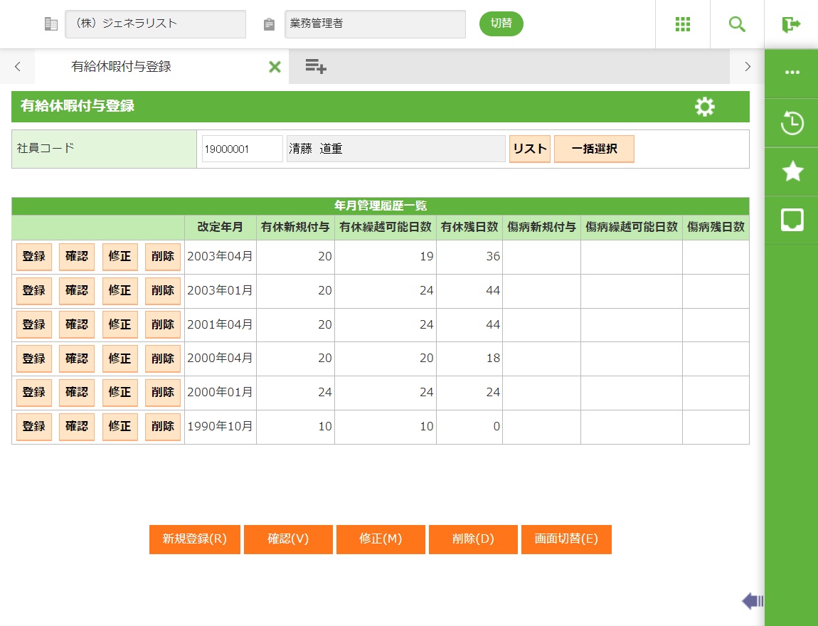 社員選択で入力した社員の有給休暇付与情報を新規登録します。詳細画面が表示されます。 |
