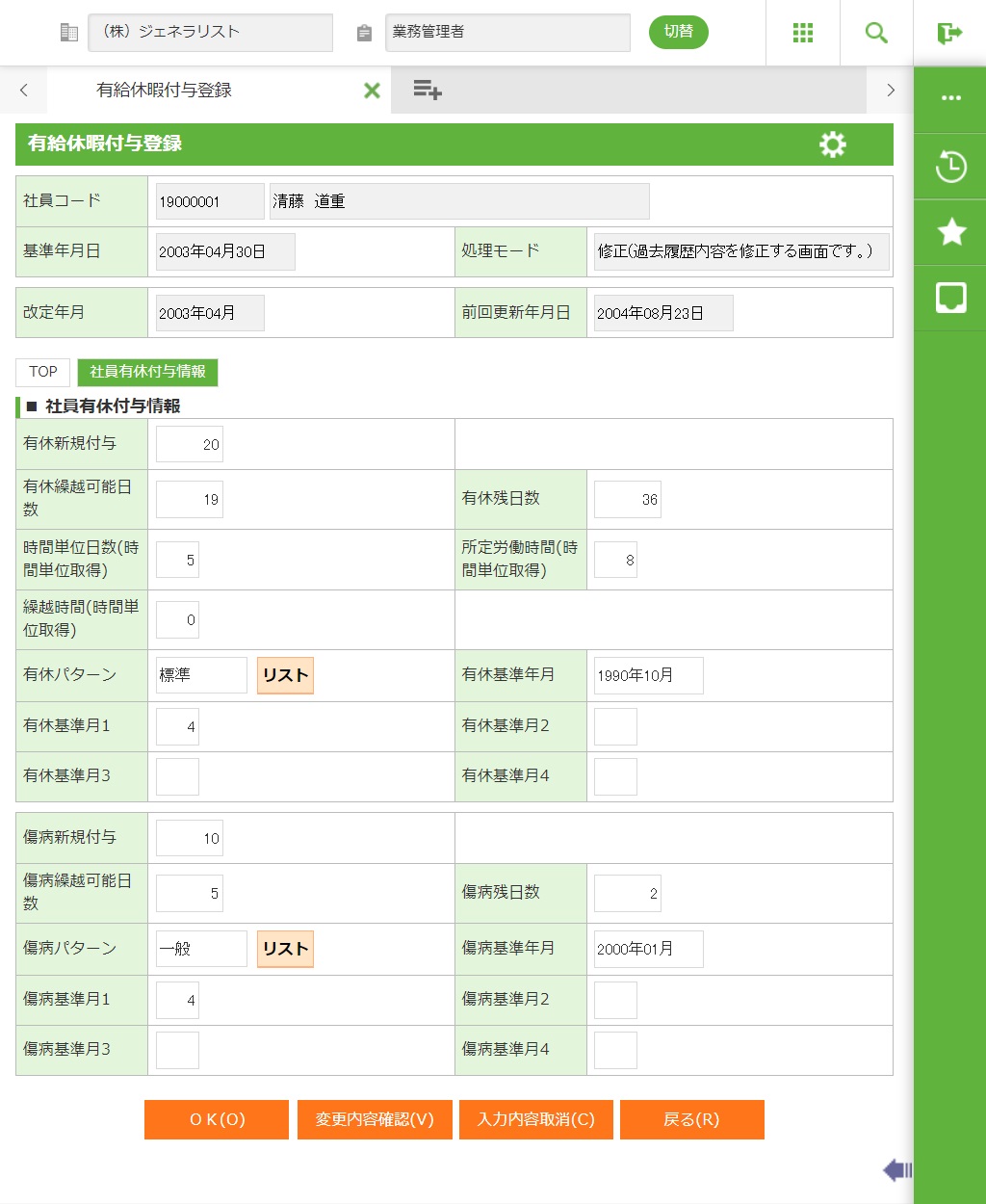 社員選択で入力した社員の有給休暇付与情報を修正します。修正画面が表示されます。 |