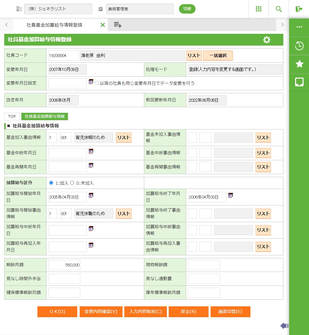 社員選択で入力した社員の社員基金加算給与情報を新規登録します。詳細画面を表示します。 |