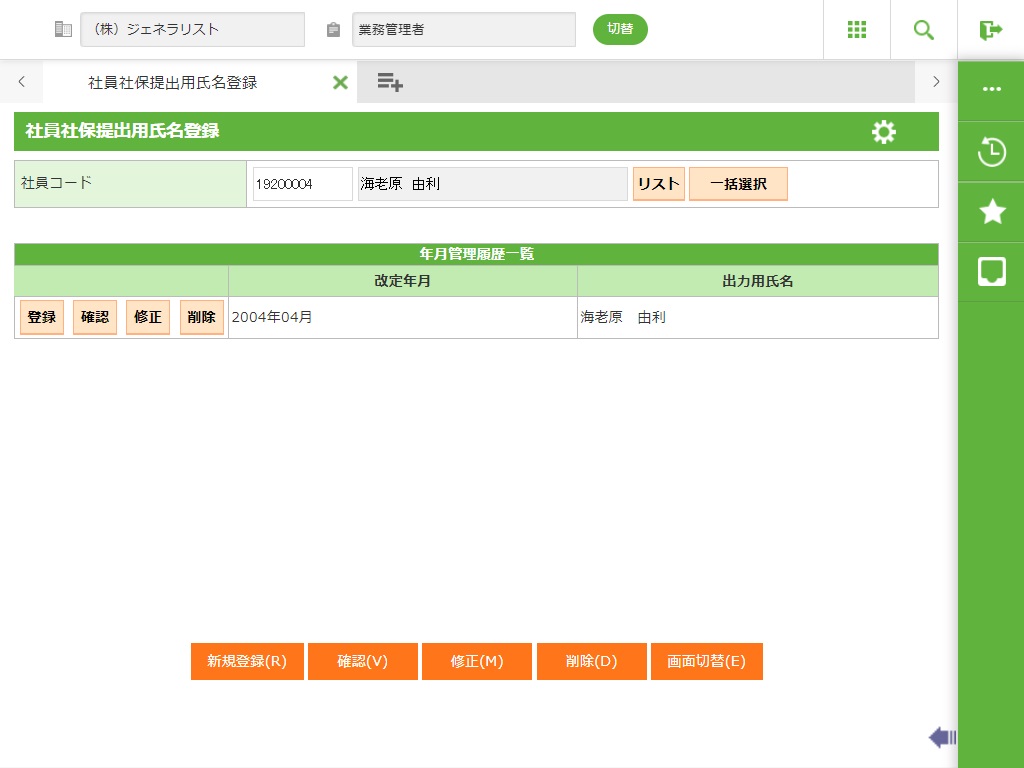社員選択で入力した社員の社員社保提出用紙名情報を新規登録します。詳細画面が表示されます。 |