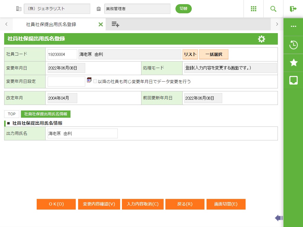 社員選択で入力した社員の社員社保提出用紙名情報を修正します。修正画面が表示されます。 |