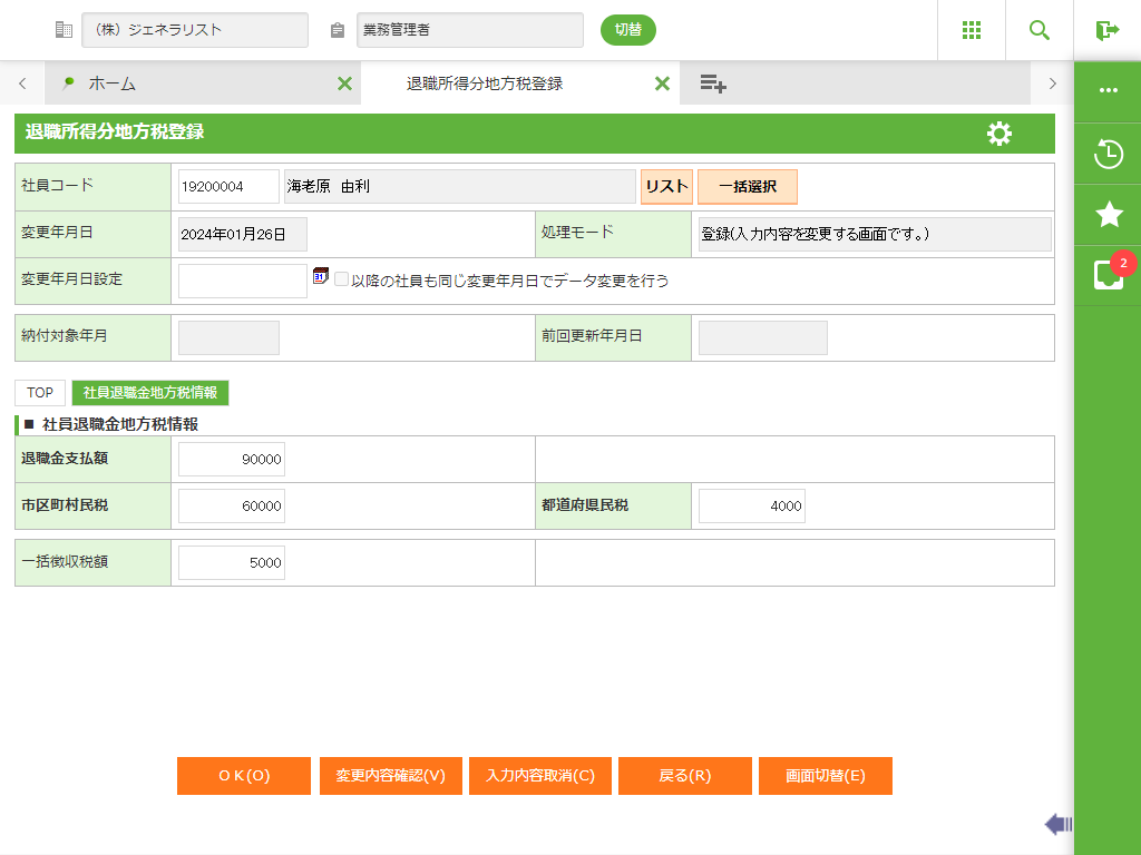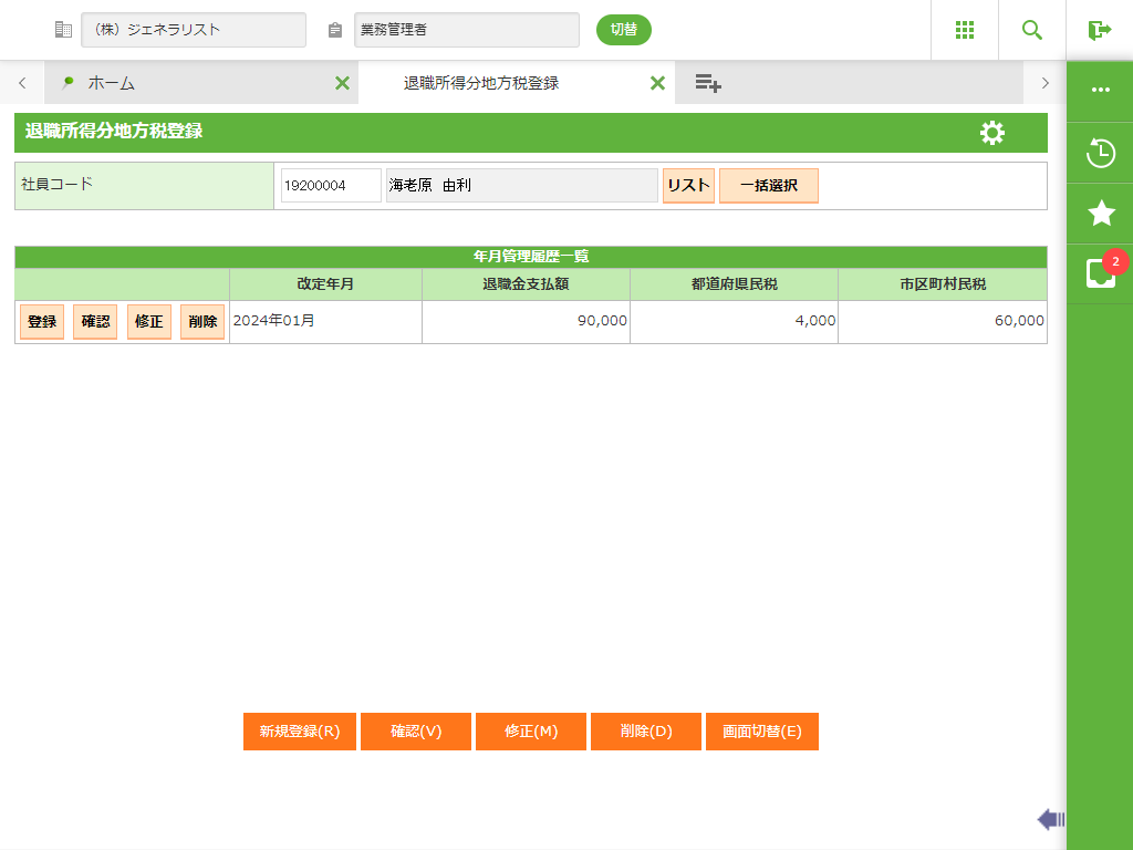 社員選択で入力した社員の退職所得分地方税情報を新規登録します。詳細画面が表示されます。 |