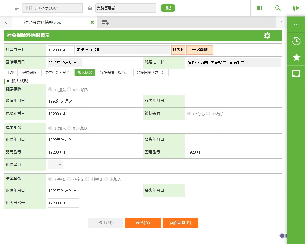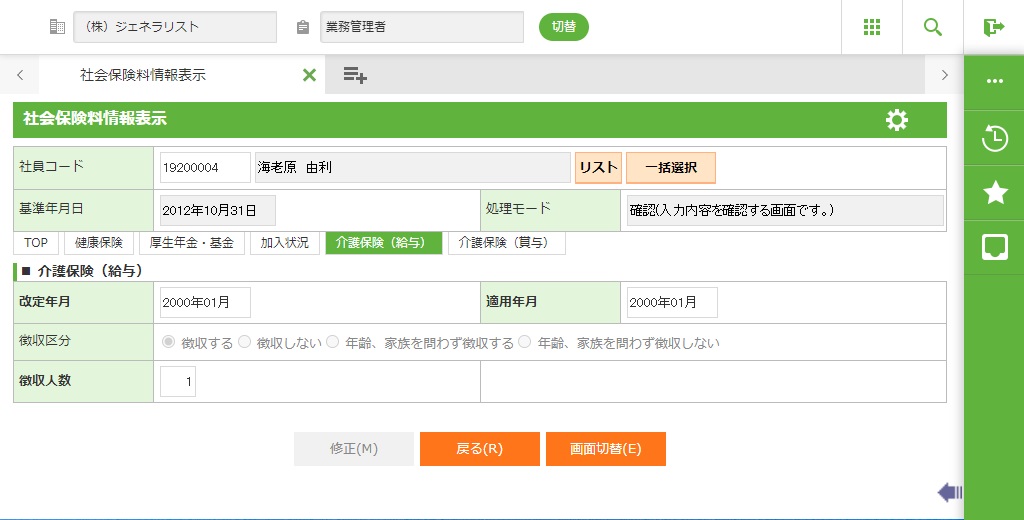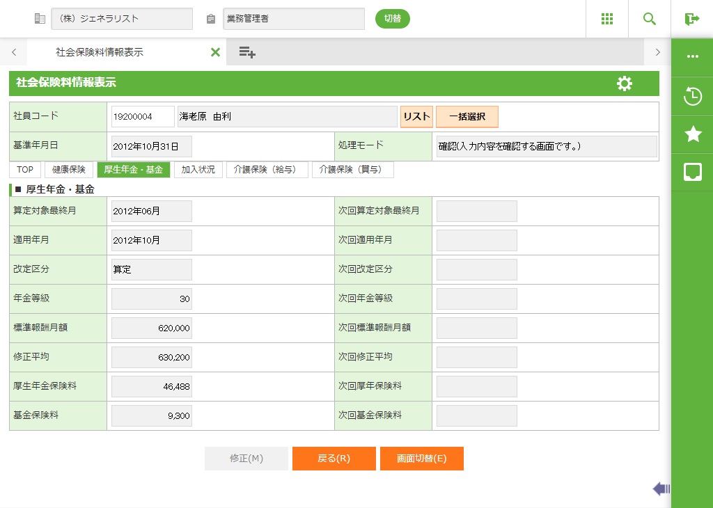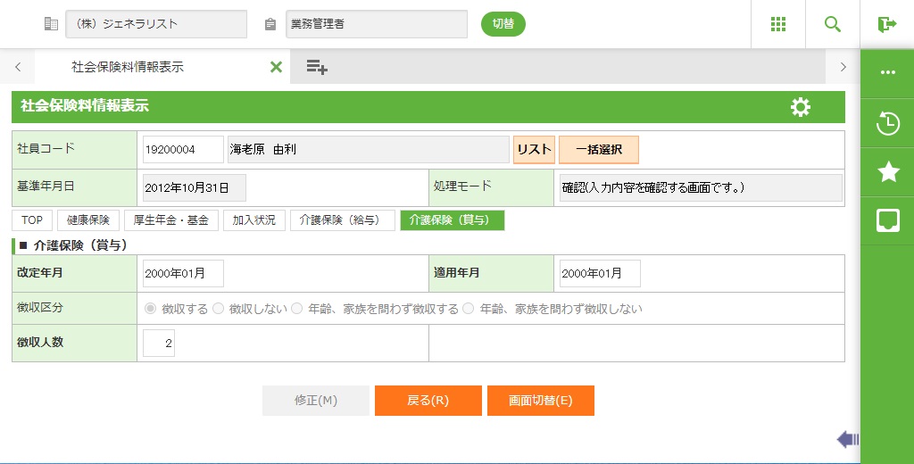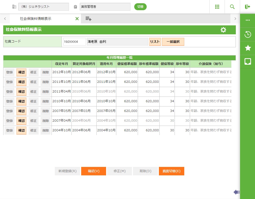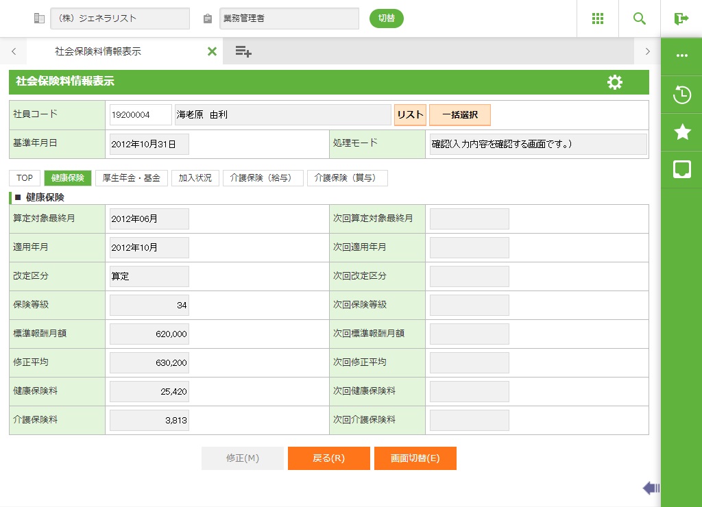 社員選択で入力した社員の社会保険料情報表示を確認します。確認画面が表示されます。 |