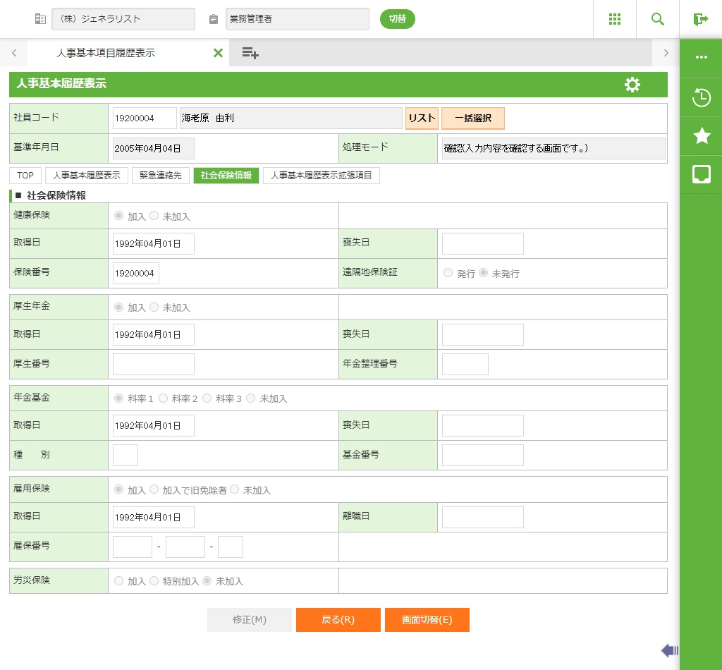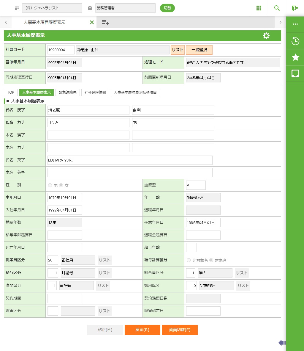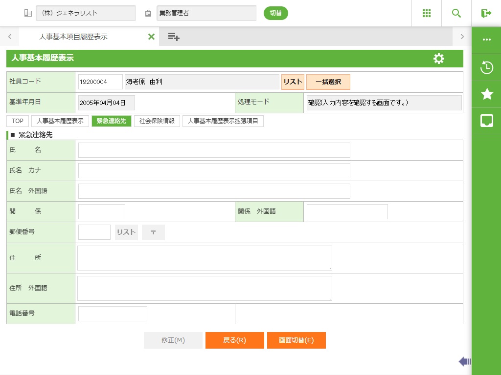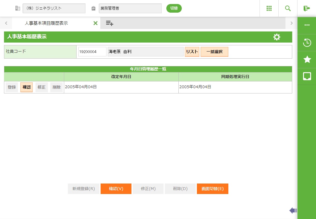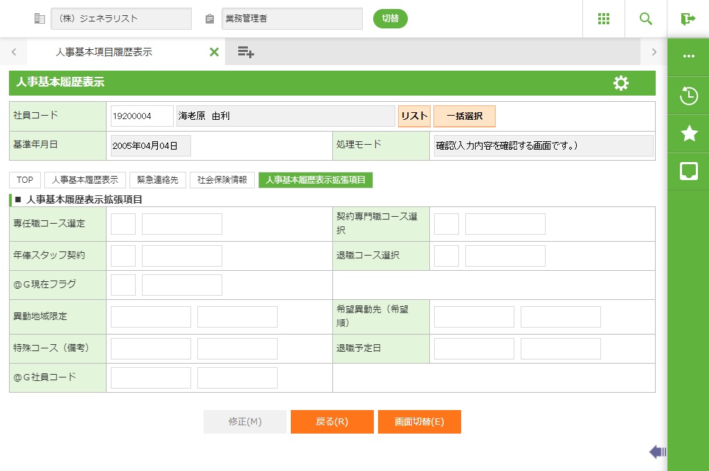 社員選択で入力した社員の人事基本履歴を確認します。確認画面が表示されます。 |