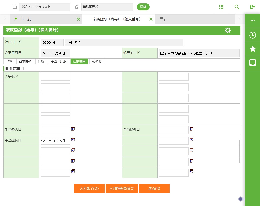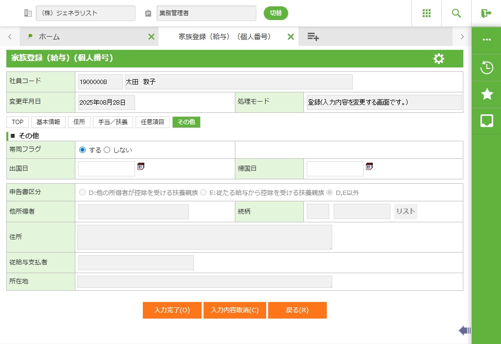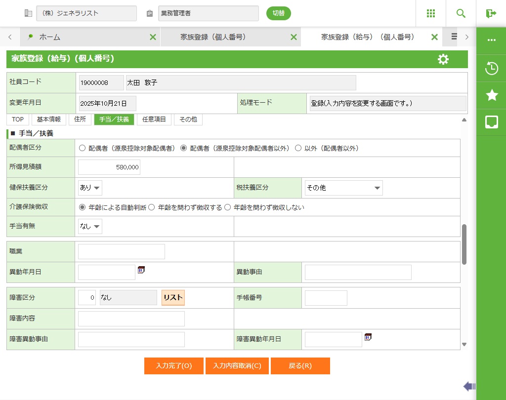 社員の家族情報を新規登録、修正します。市区町村から通知された個人番号の登録も可能です。