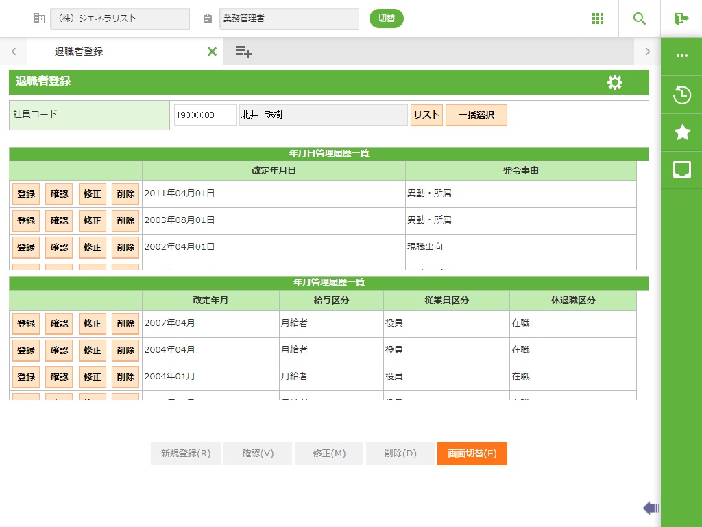 社員選択で入力した社員の退職者情報を確認します。確認画面を表示します。 |