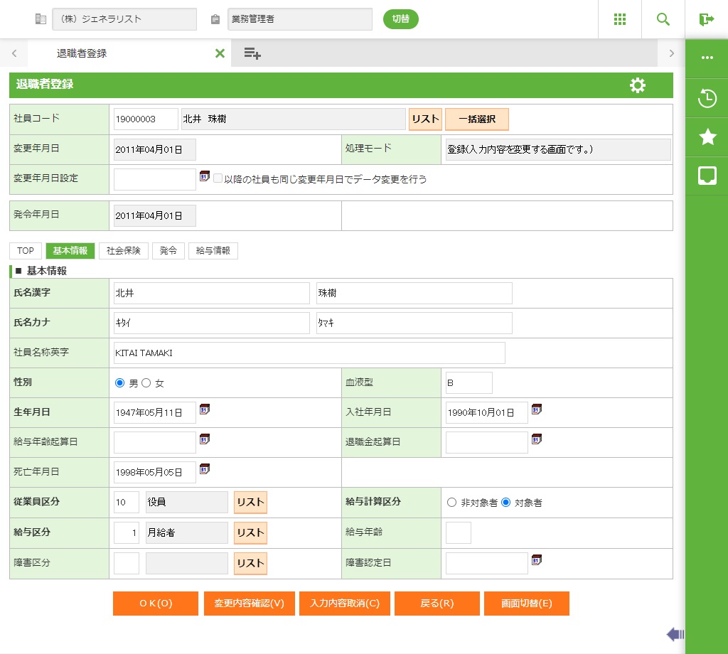 西暦6桁または和暦5桁(元号は和暦省略入力記号(アルファベット1文字))で入力します。 社員基本情報の休退職区分が「退職」、「死亡退職」の場合は必須入力となります。 |