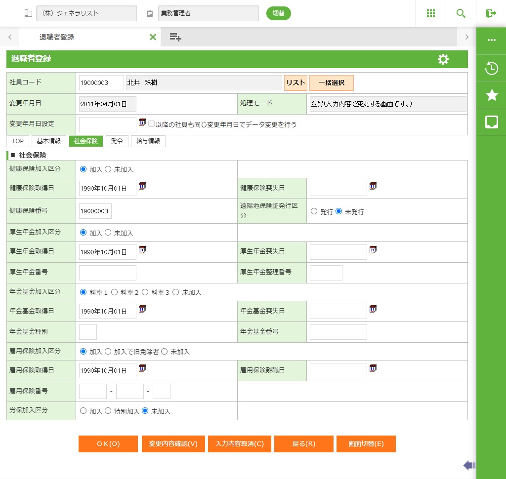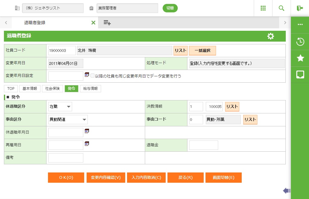 社員の退職発令情報を登録します。