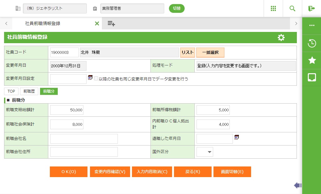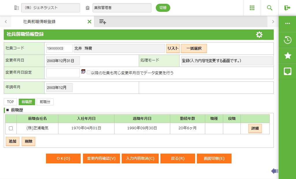 社員選択で入力した社員の社員前職情報を確認します。確認画面を表示します。 |