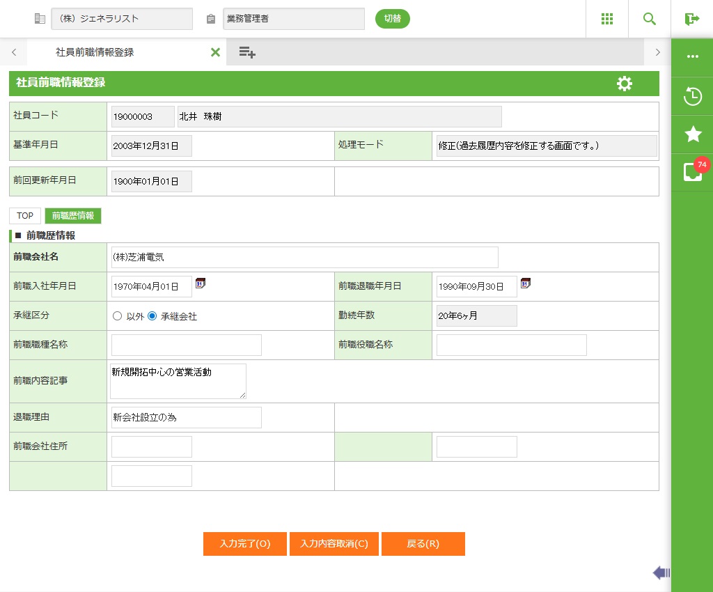 社員選択で入力した社員の社員前職情報を新規登録します。詳細画面を表示します。 |