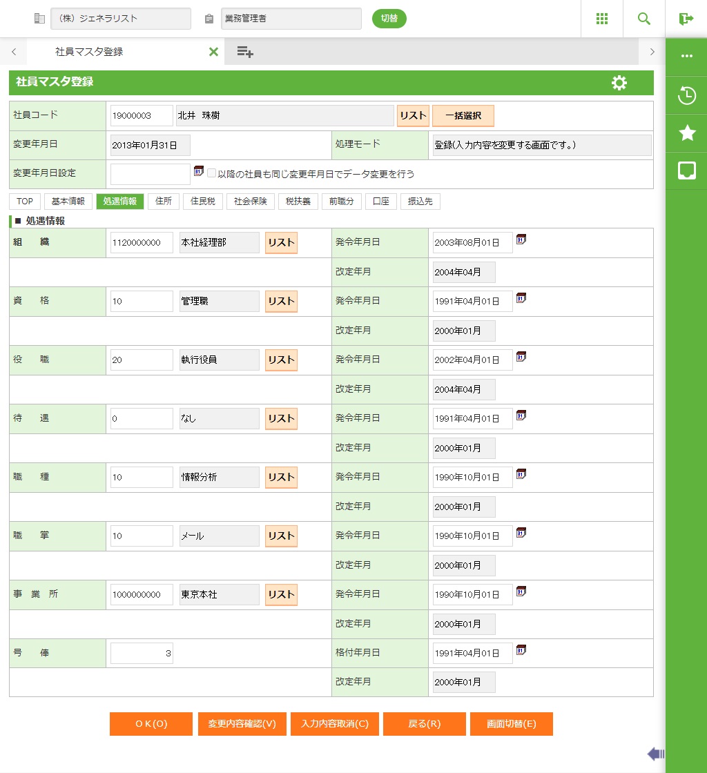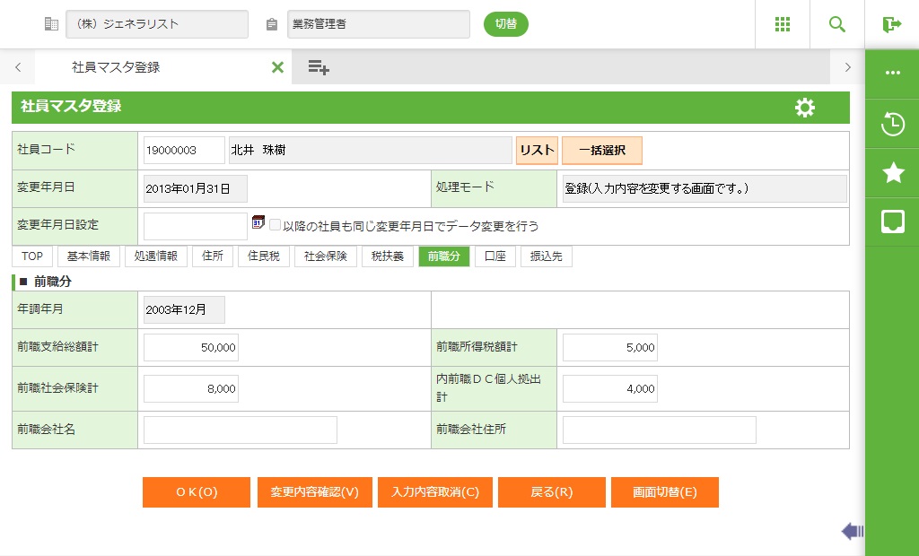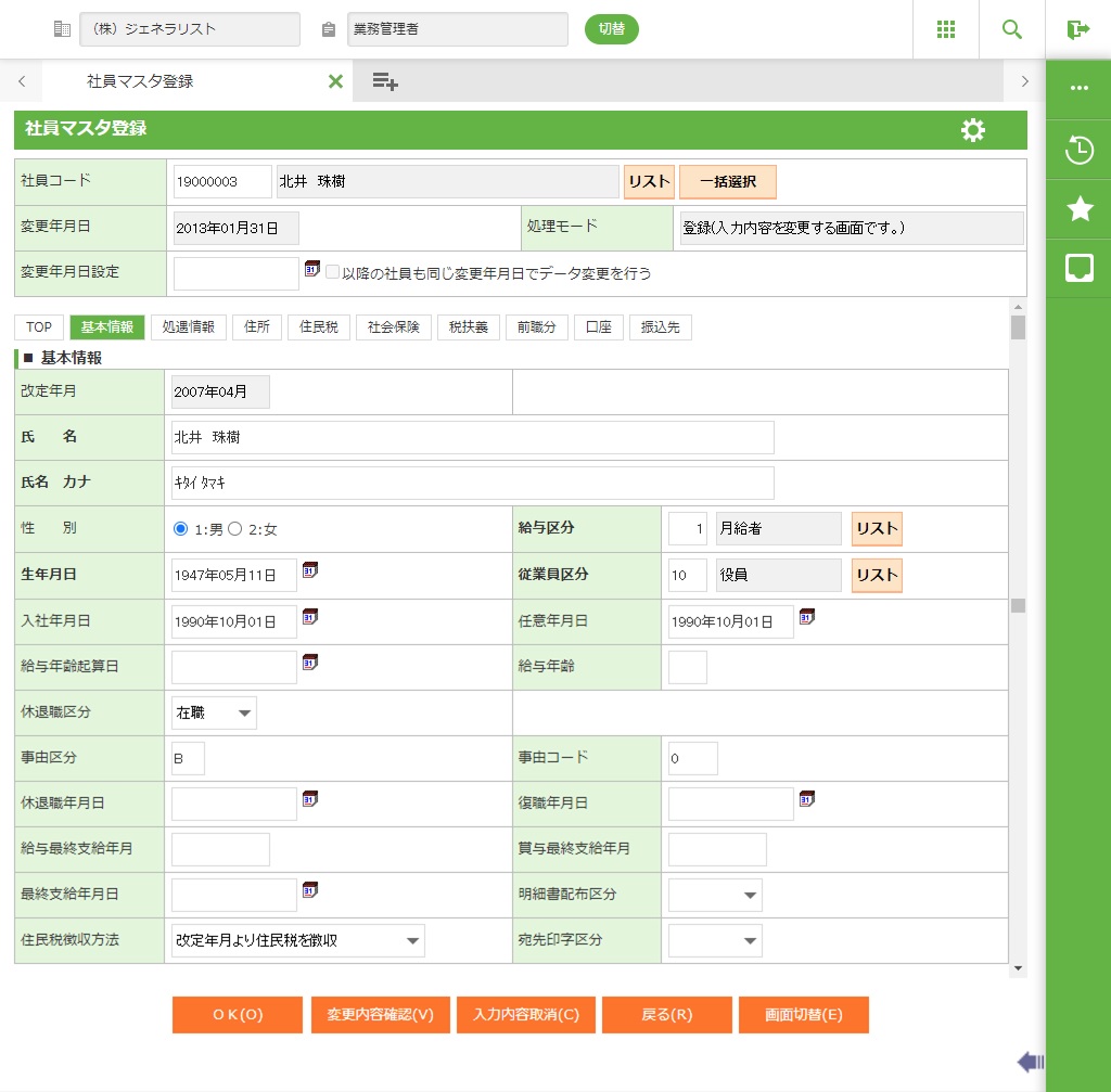 初めて支給する給与の支給年月を改定年月として、社員の基本情報、処遇情報、住所情報、住民税情報、社会保険情報、扶養情報、前職情報、口座情報、有給・傷病情報の登録を行います。