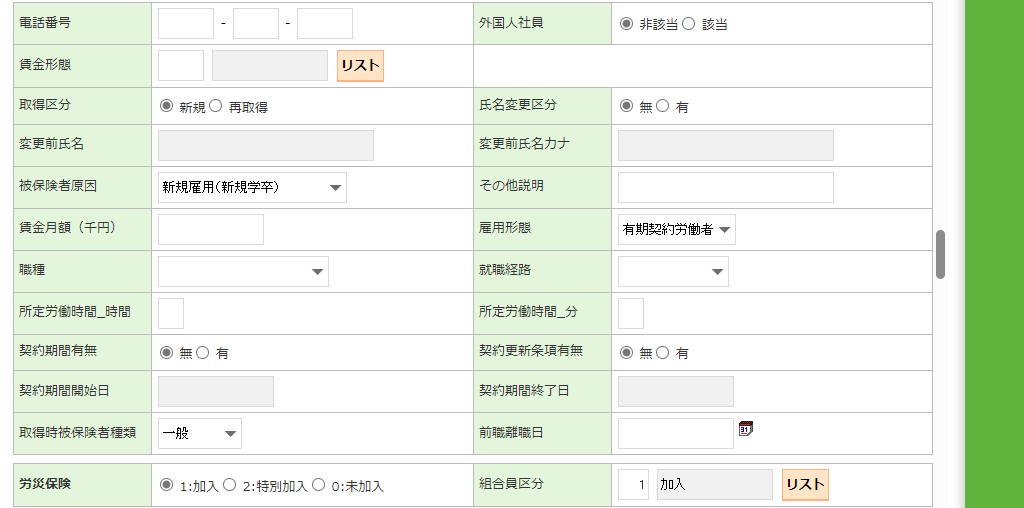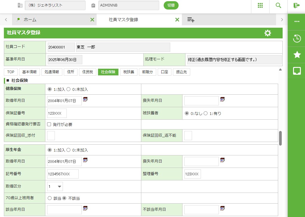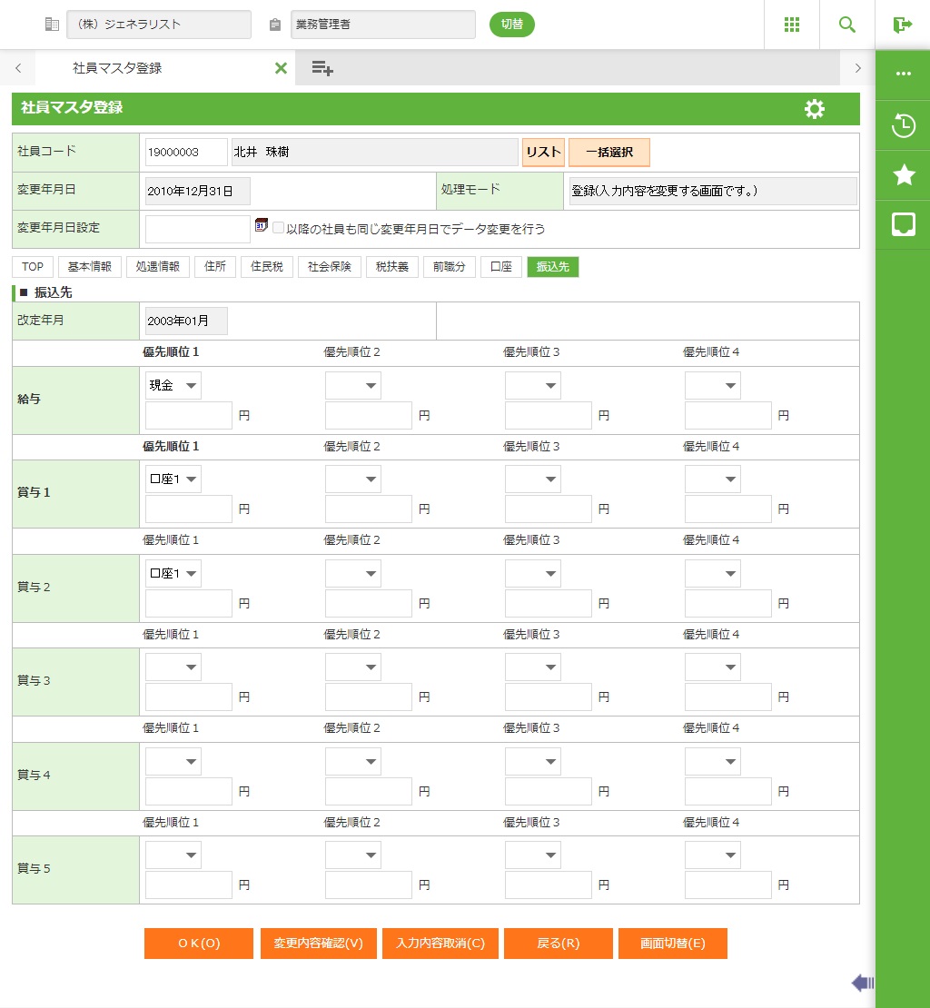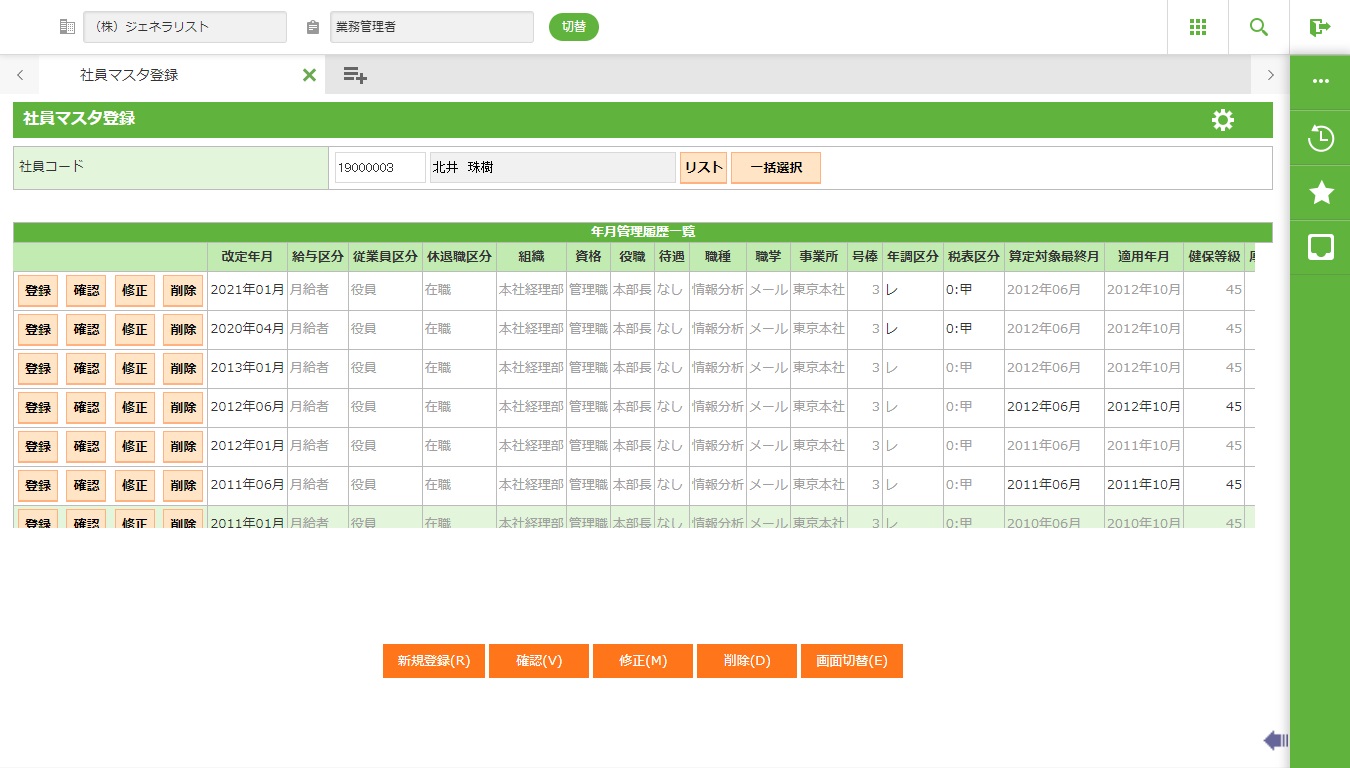 初めて支給する給与の支給年月を改定年月として、社員の基本情報、処遇情報、住所情報、住民税情報、社会保険情報、扶養情報、前職情報、口座情報、有給・傷病情報の登録を行います。
