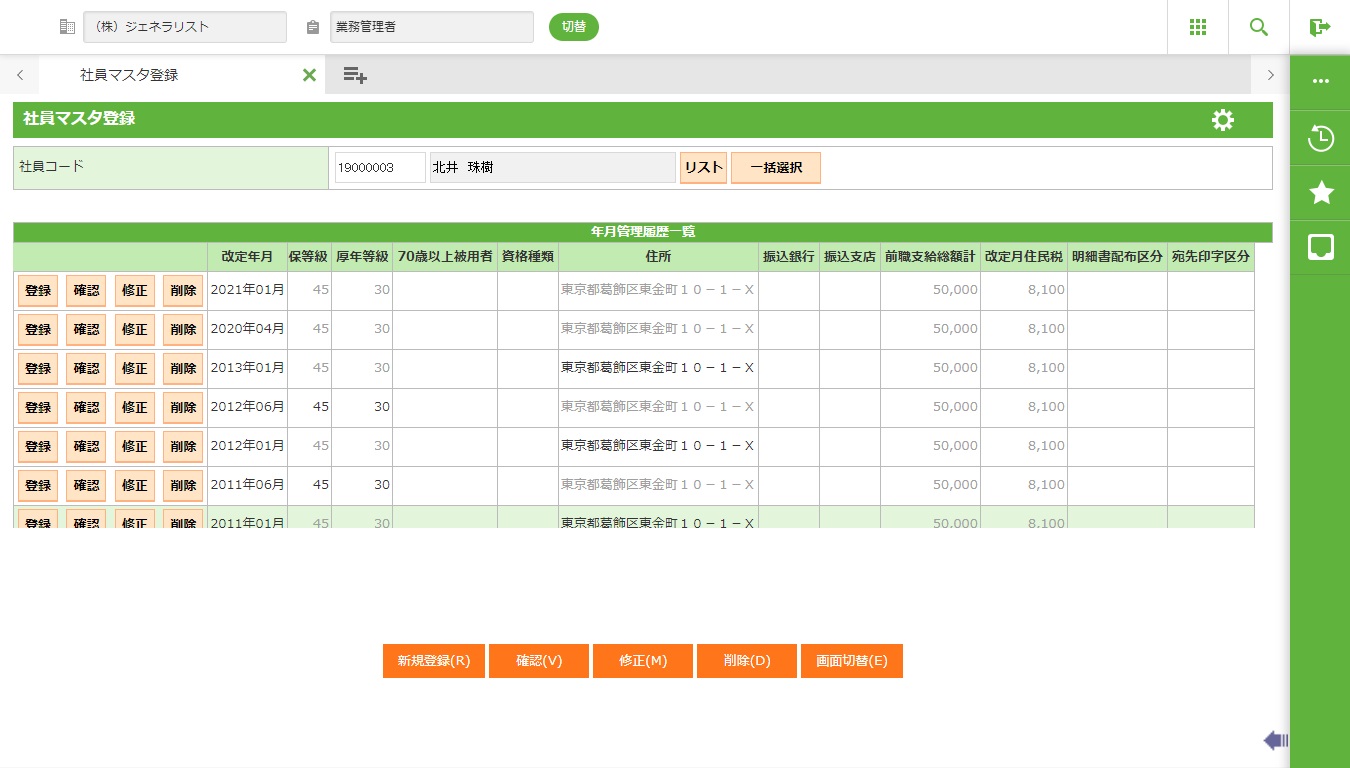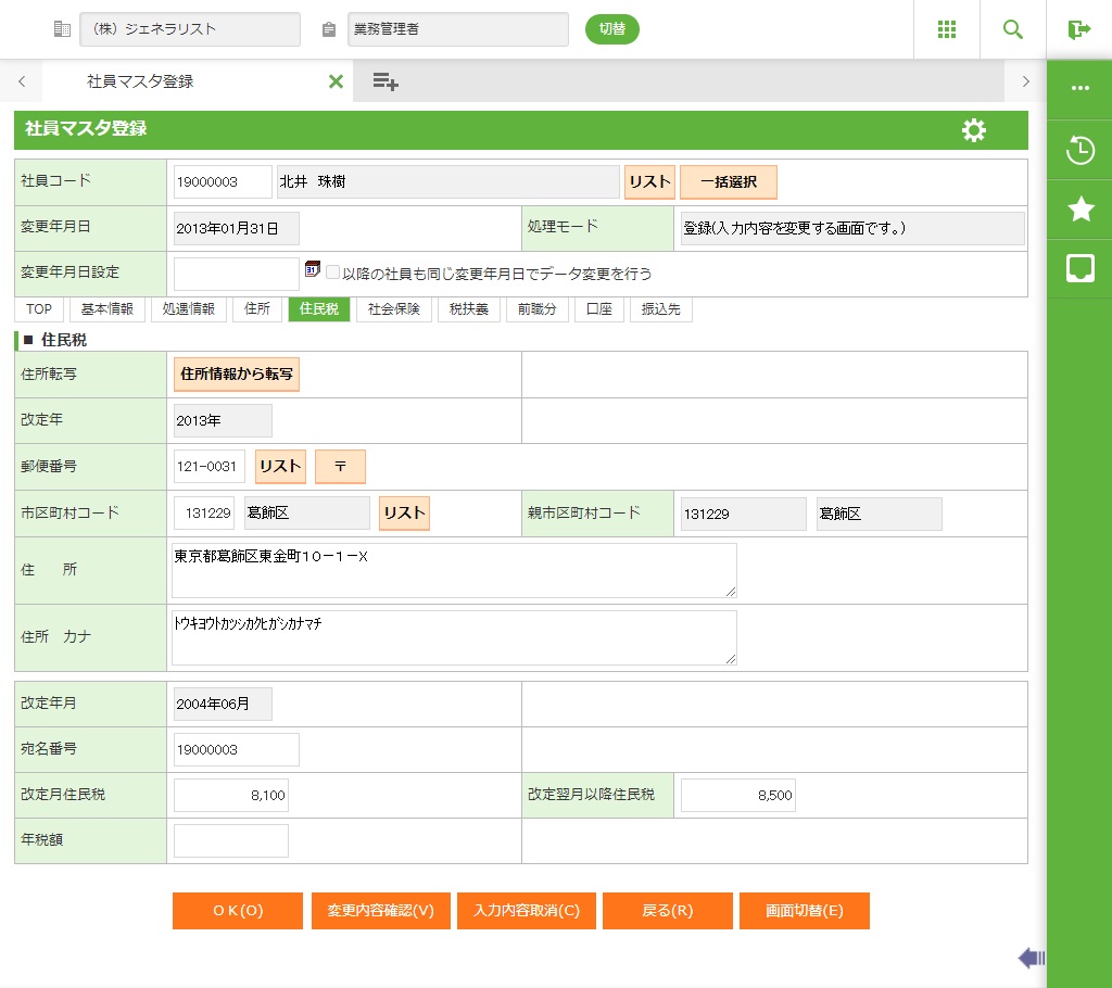 ・ 社員の住所変更を行います。あらかじめ、変更先の市区町村を市区町村マスタに登録する必要があります。