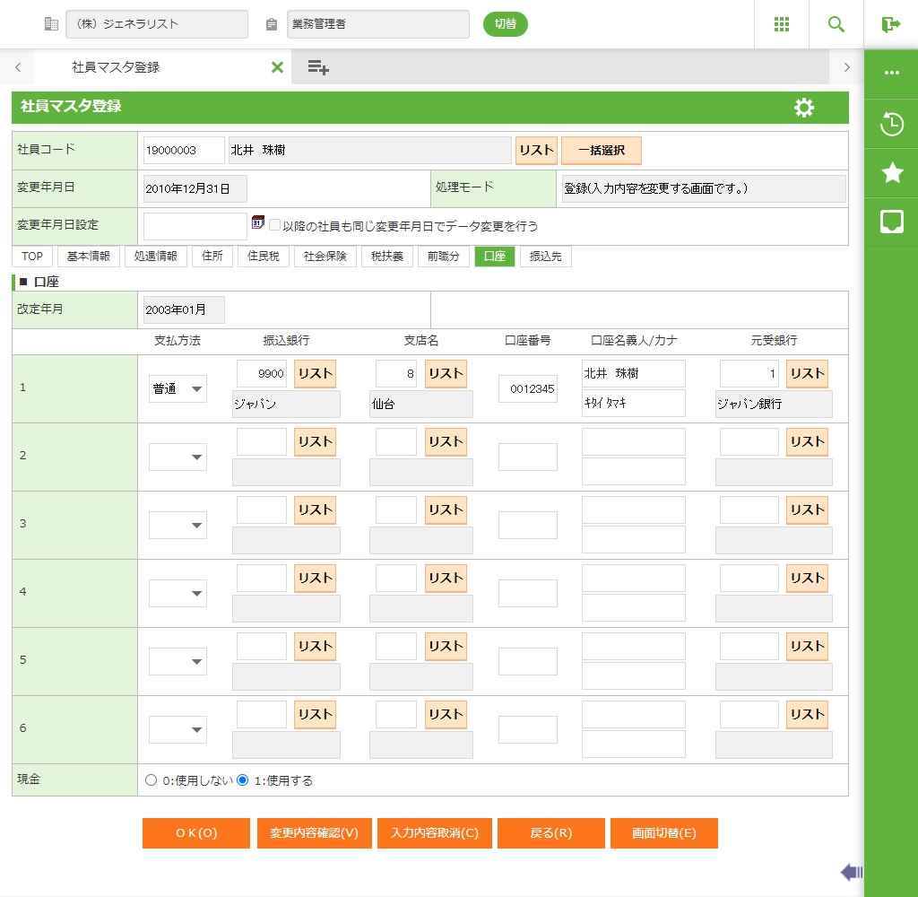 初期表示時に、口座名義人カナの変換を行いますが、入力について制限はなく全角や小さいカタカナ等の文字も登録できます。