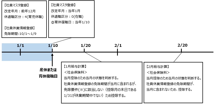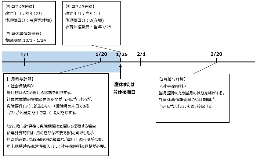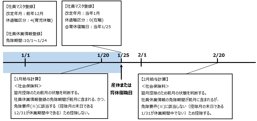 A 当月(例:1月)給与計算後に産休または育休から復帰した場合