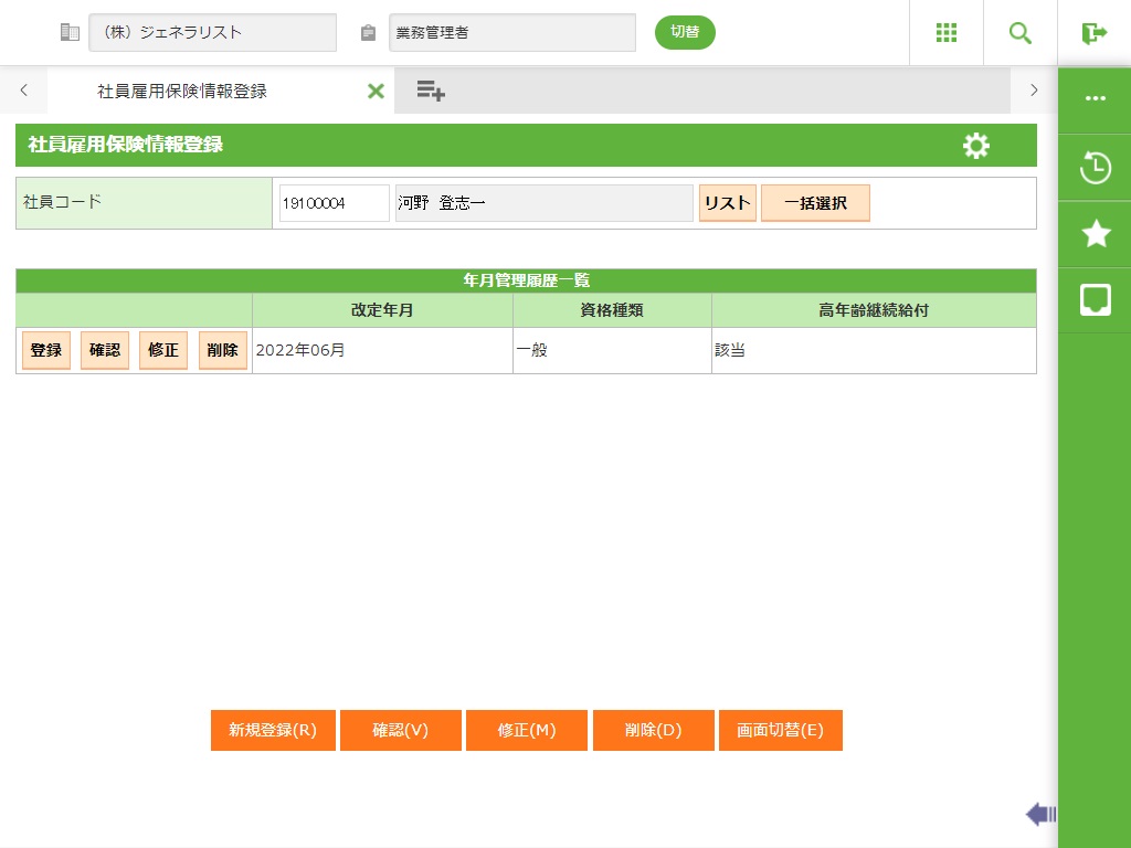 社員選択で入力した社員の社員雇用保険情報を確認します。確認画面を表示します。 |