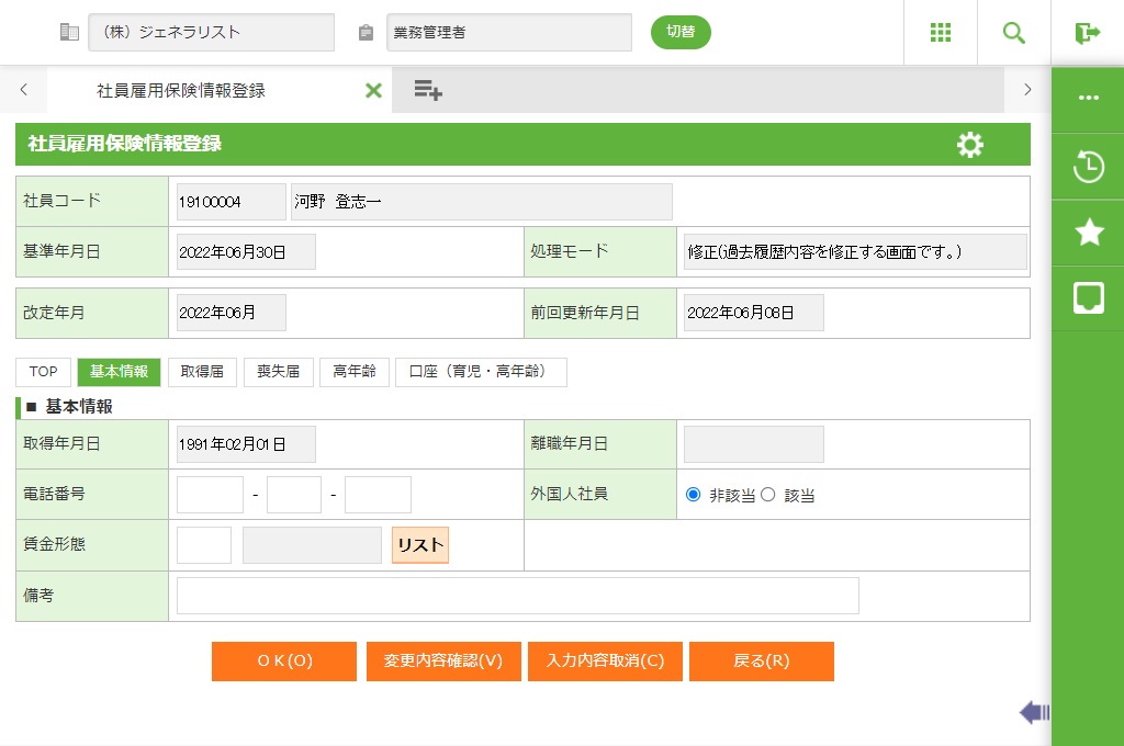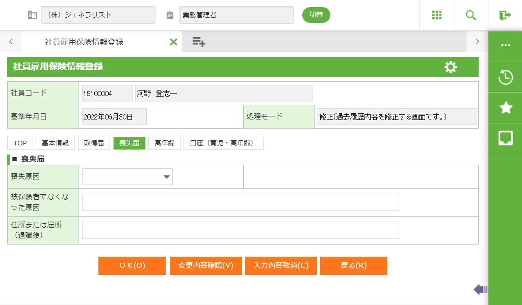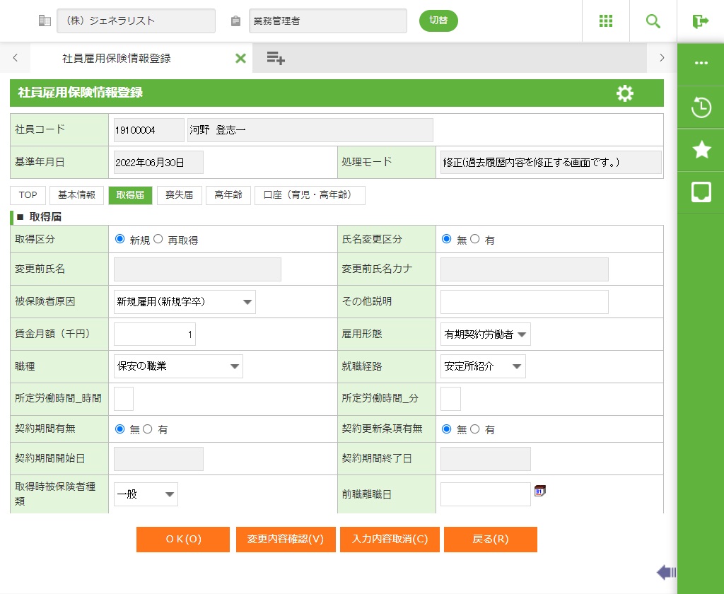 ・ 定年退職後再雇用や正社員登用など雇用形態の変更で社員番号の変更を行う場合、雇用保険の取得日年月日は、通常、社員番号変更前の取得年月日と同じ日付ですのでご注意ください。