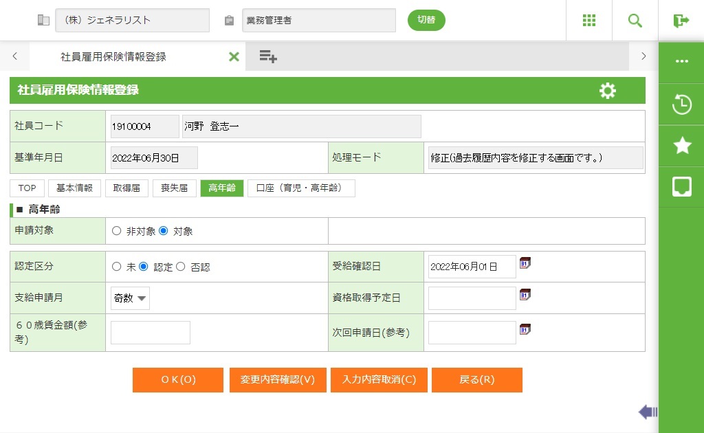 高年齢継続給付の認定状況(「該当」「非該当」)を表示します。 |