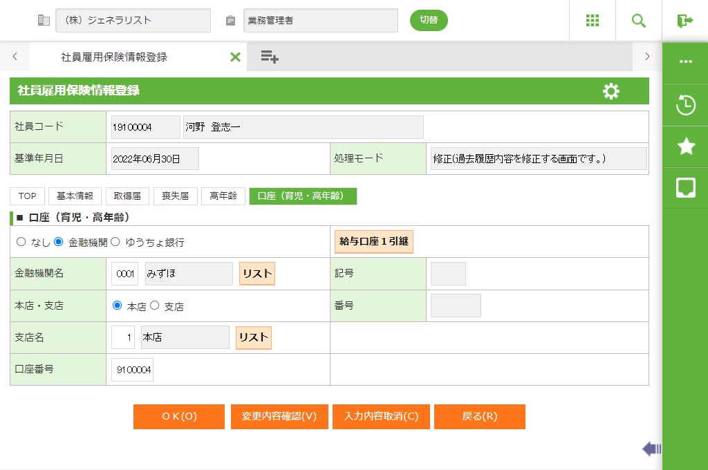 ・ 給与口座1にゆうちょ銀行の口座を設定し、「給与口座1引継」ボタンを押下した場合、「金融機関」関係項目にコピーしますが、「ゆうちょ銀行」へ手修正が必要です。
