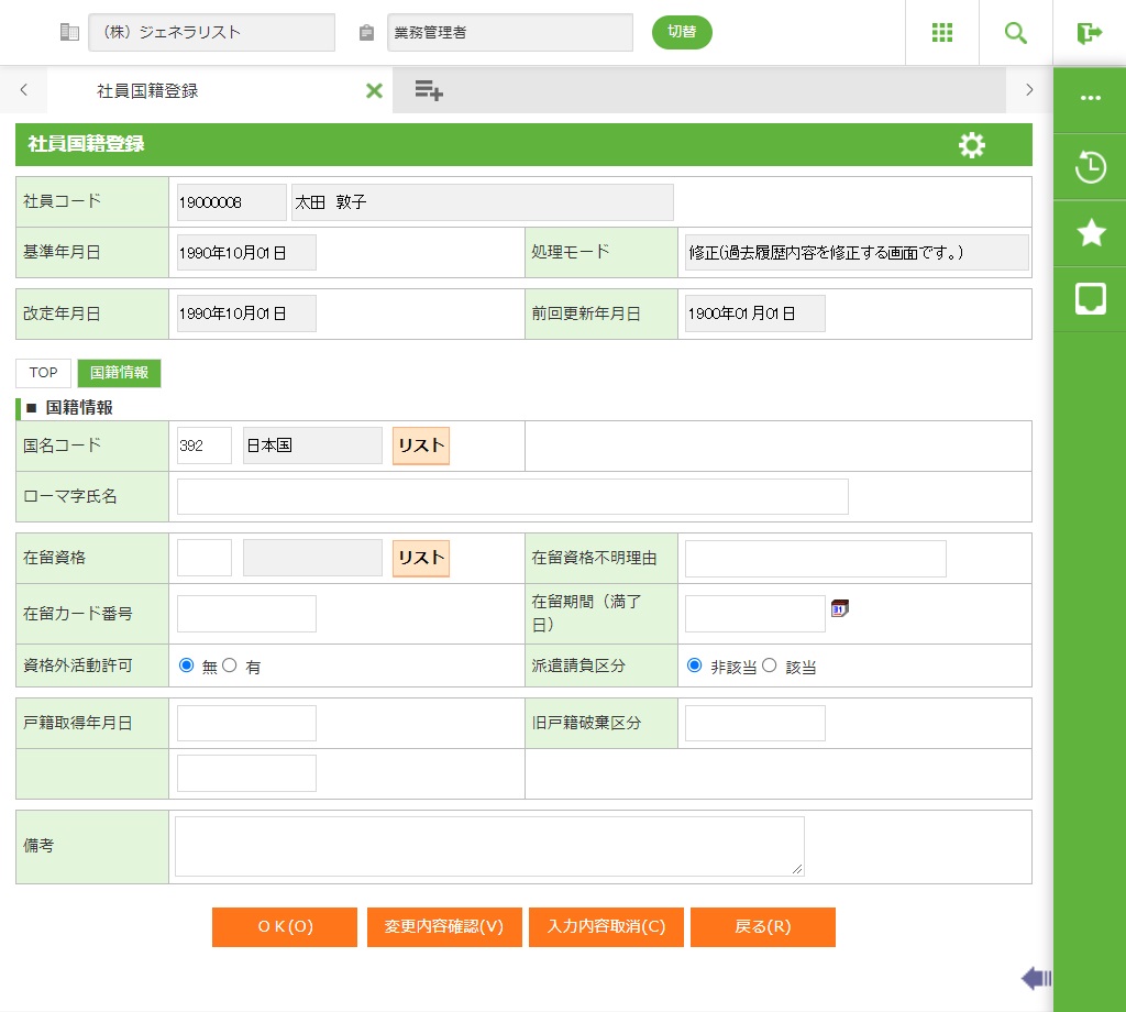 社員選択で入力した社員の国籍情報を修正します。修正画面を表示します。 |