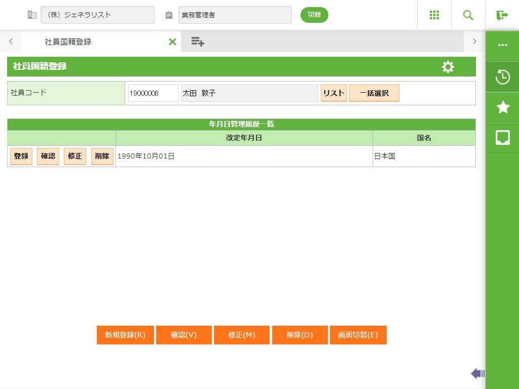社員選択で入力した社員の国籍情報を新規登録します。詳細画面を表示します。 |