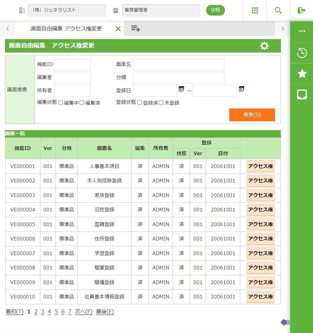 画面編集機能で作成した画面のアクセス権を変更する機能です。