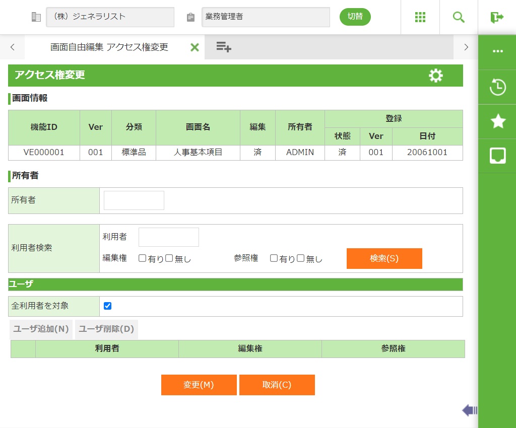 | 変更(M) | 画面のアクセス権を一覧に表示されたユーザとそのアクセス権に、また、画面の所有者を入力されている所有者に変更して、画面アクセス権変更機能画面に遷移します。 |