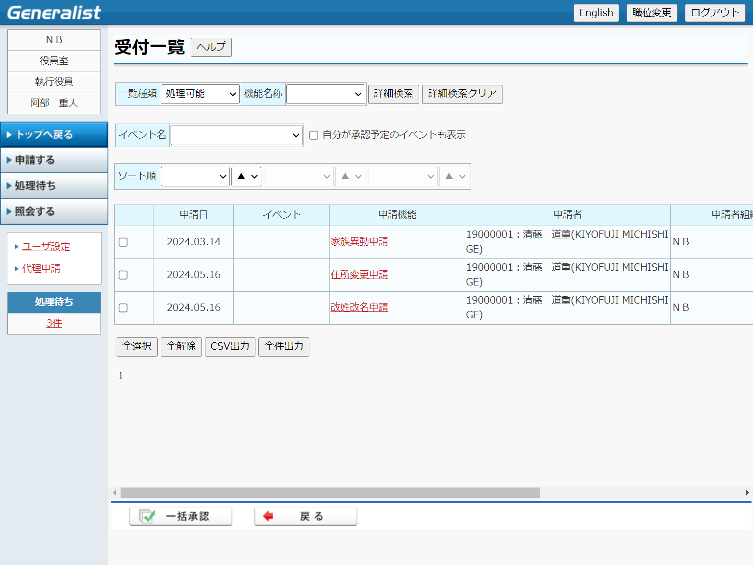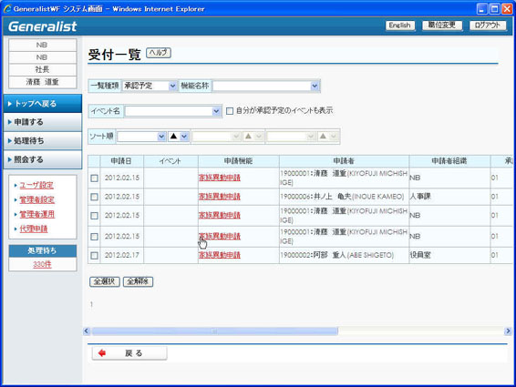 ・ 受付一覧の機能名称として各申請機能を選択することにより、選択された申請のみが一覧表示されます。
