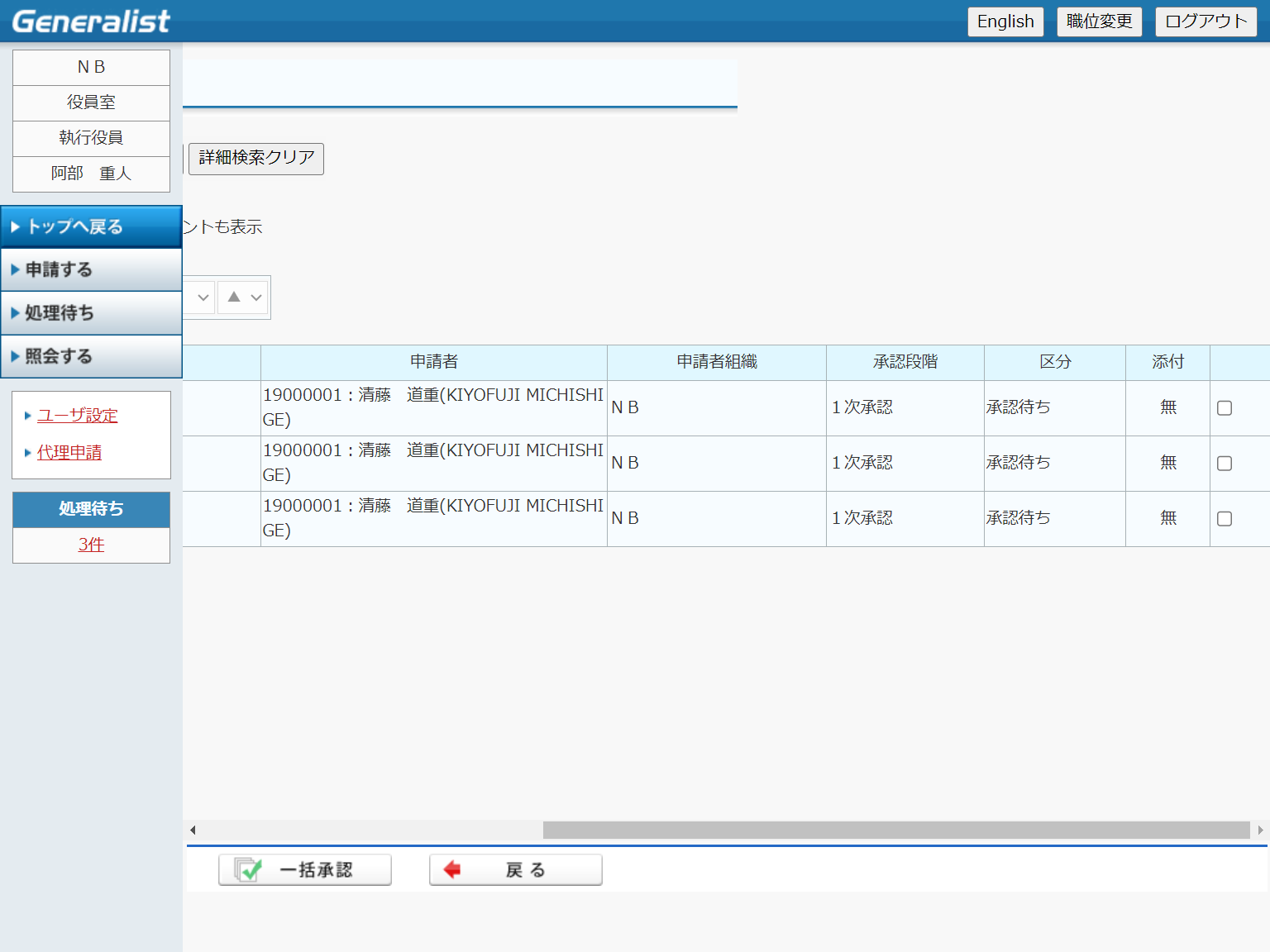 ・ 複数の申請文書を選択し、「一括承認」ボタンを押下することで選択さえた申請文書の一括承認を行うことができます。