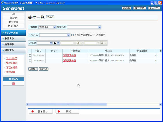 ・ ログインユーザがシステム内で職位兼務している場合、受付一覧には、全職位分の処理案件が表示され、該当する立場で処理を行います。