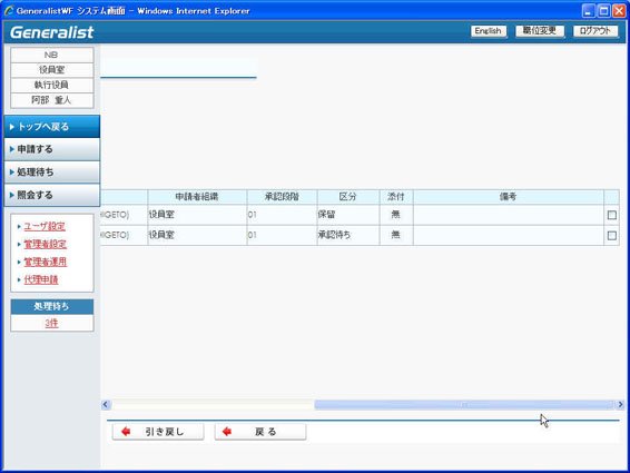 処理済み一覧より申請案件を選択し、引き戻しを行います。