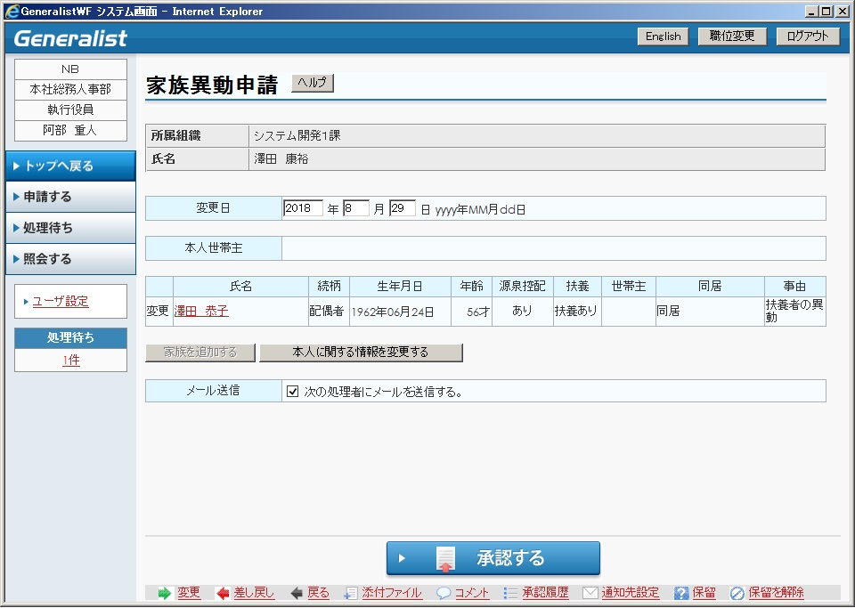 最終承認時に異動申請案件の決裁処理を行います。 |