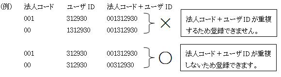 ・ Generalist/WFではユーザ情報を登録するさいに法人コードを先頭に付加してユーザIDを管理しています。従って、法人コード+ユーザIDが重なるユーザは登録する事が出来ません。