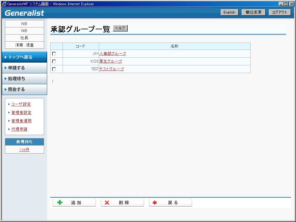・ 一覧から承認グループをチェックボックスにより選択した状態で「削除」ボタンを押下することにより、選択された承認グループを削除することができます。