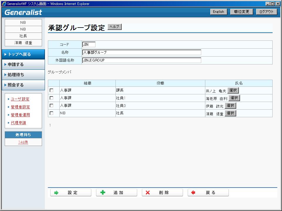 ・ 「設定」ボタンを押下することにより、設定内容が保存され、承認グループ一覧画面が表示されます。