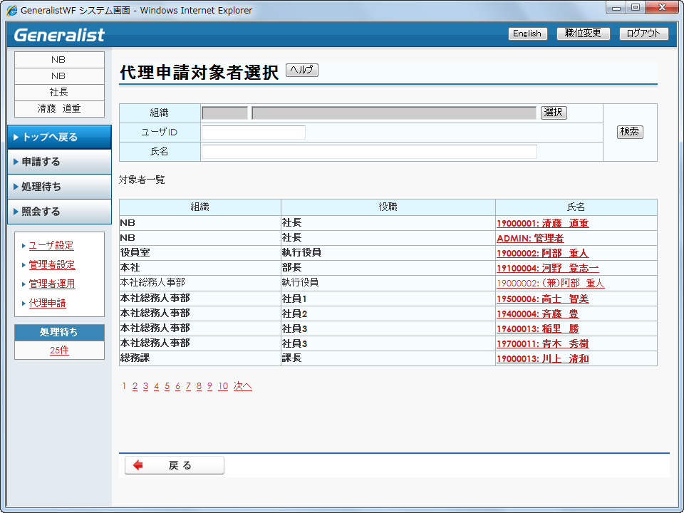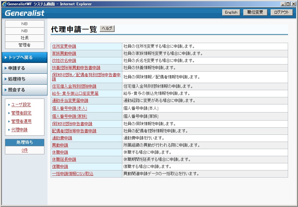 代理申請対象者選択画面を表示します。一覧に表示される申請機能はユーザが権限を持つ申請機能のみが表示されます。 |