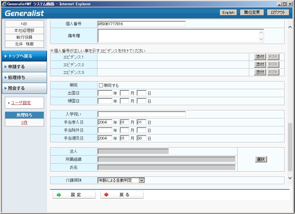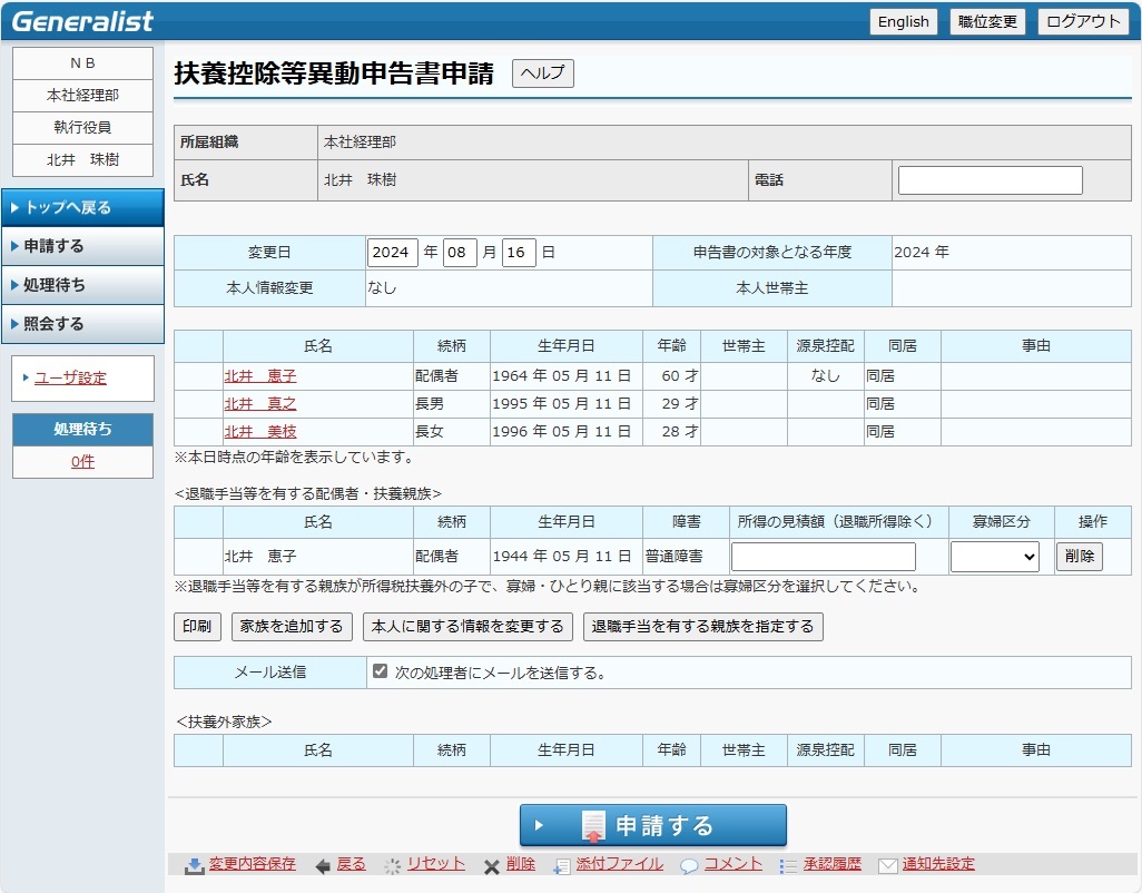 ・ 家族の個人番号の申請も可能です。個人番号に関する項目は最終承認後、Generalist/MNに即時反映されます。