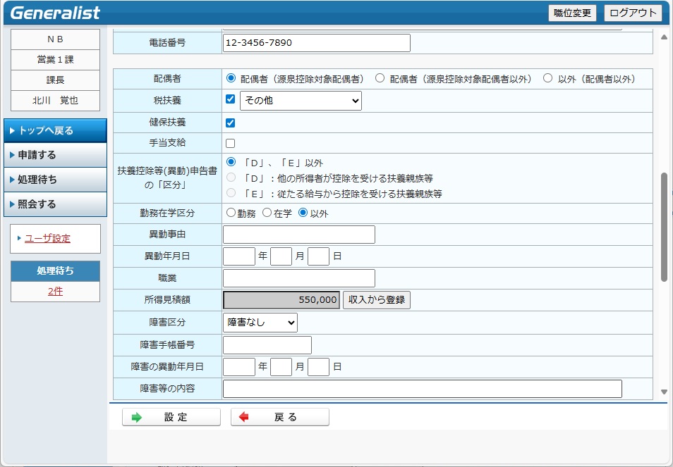 ・ 扶養控除等異動申告書には本人や家族に関する情報の入力が必要です。よって、本機能は家族異動申請機能としても利用することができます。運用に応じて、家族異動申請と使い分けてください。