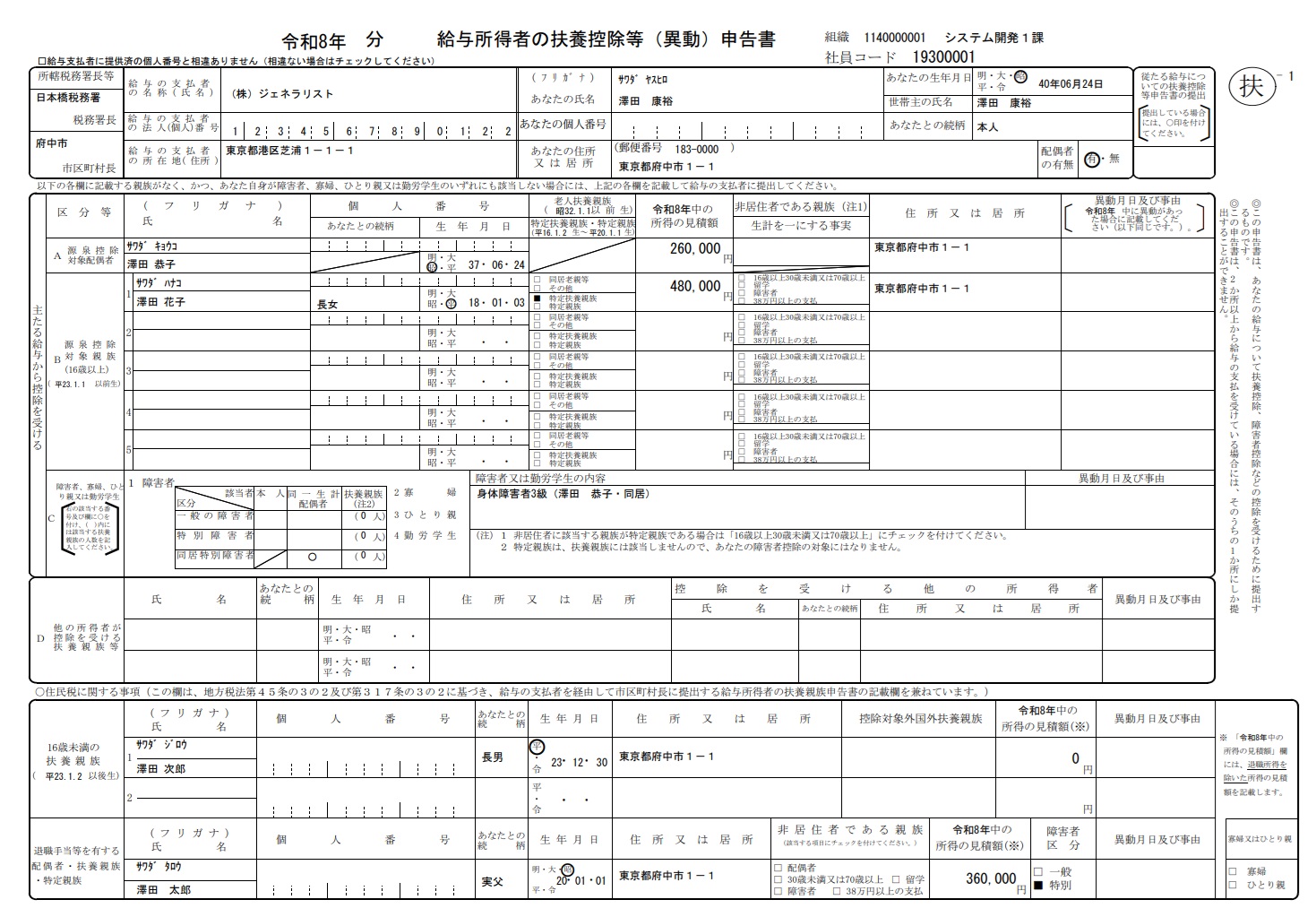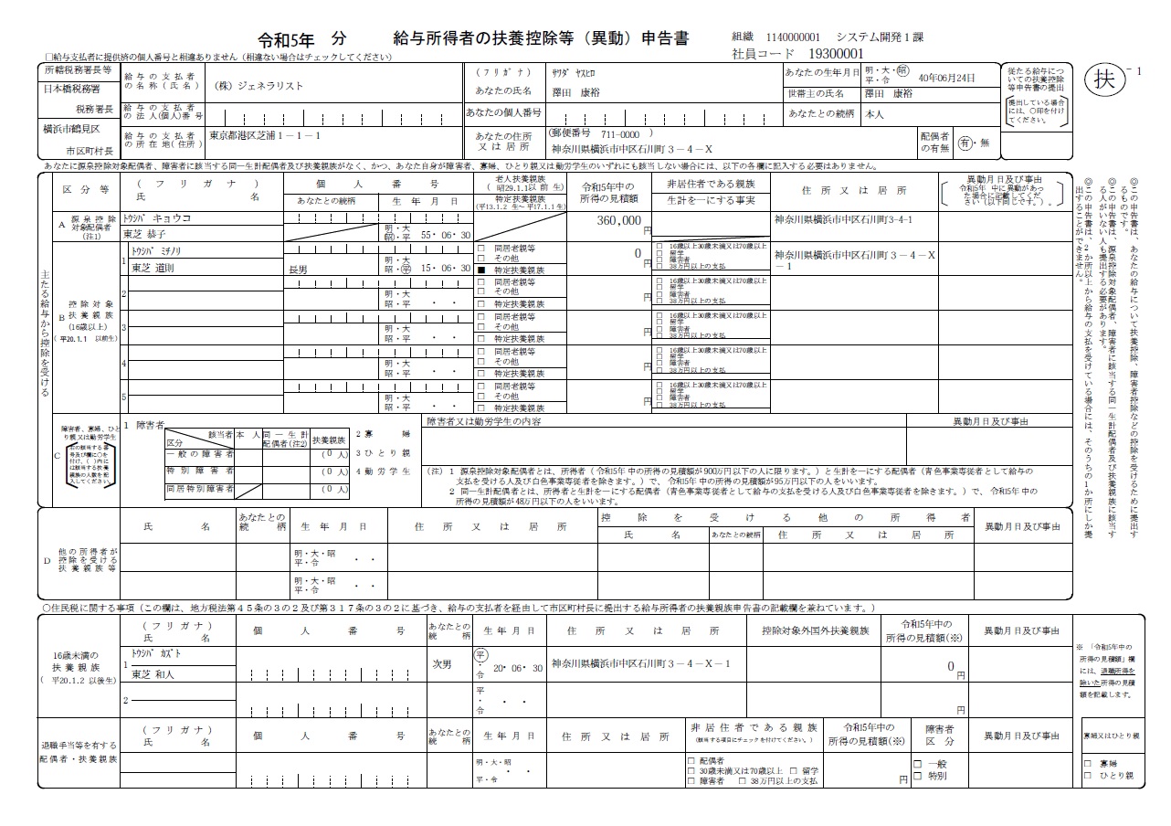 ・ 2016年以降、扶養控除等異動申告書はPDF形式でのみ出力可能です。システム設定ファイル(config.properties)の「帳票出力形式フラグ(generalist-fuyokojo-print-method)」をPDF形式に設定してください。