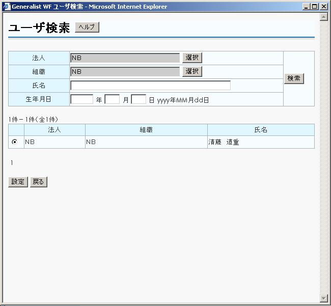 法人、組織、氏名または生年月日に入力されたユーザを検索し、リストボックスに表示します。 |