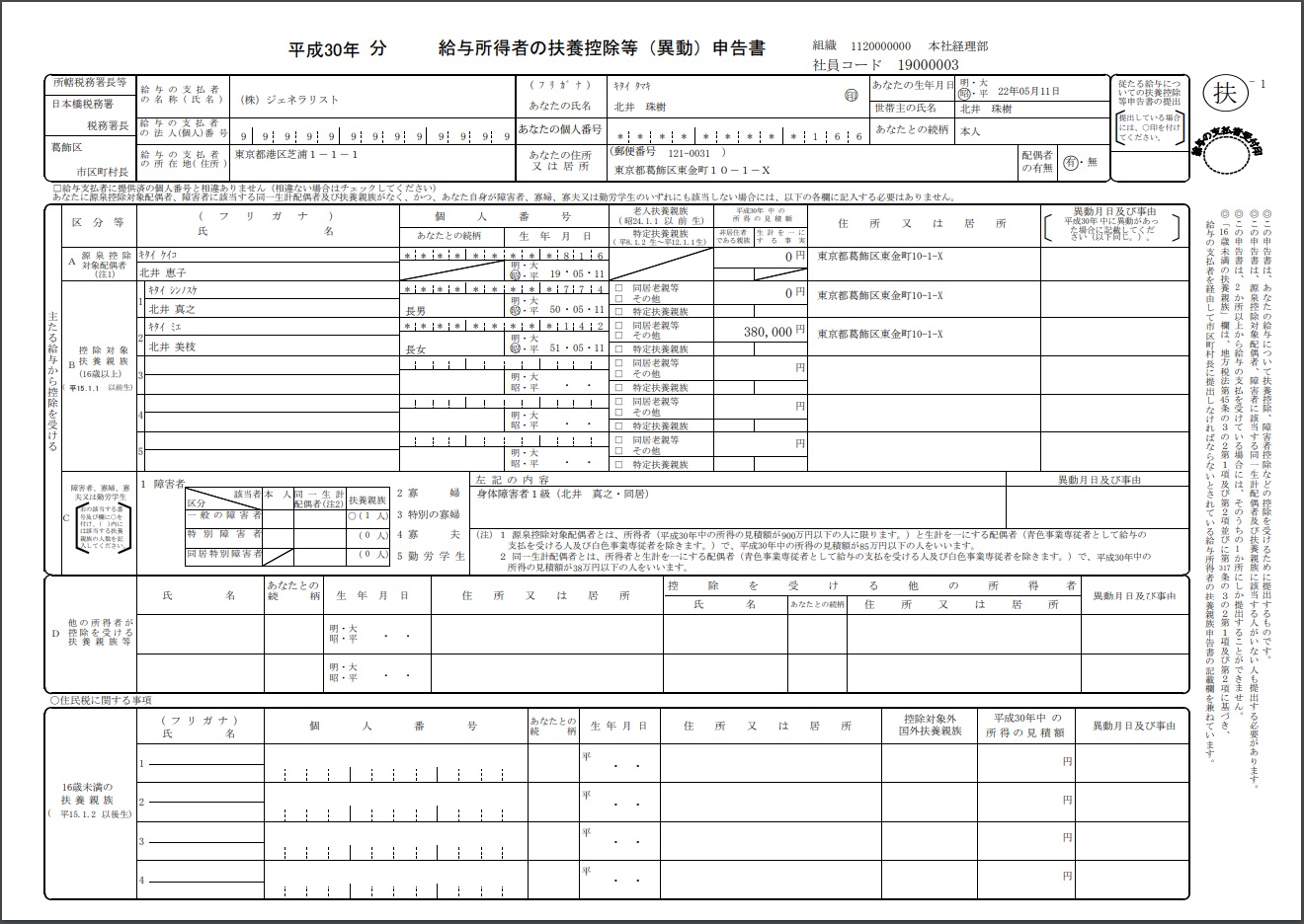 ・ 「16歳未満の扶養親族」欄において、2019年分の帳票レイアウトには「令」の記載がないため、令和生まれの扶養親族の生年月日を平成に換算して印字します。
