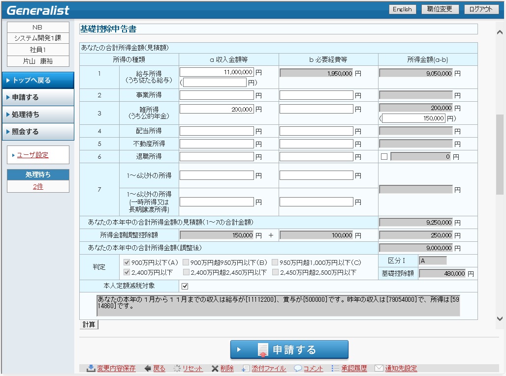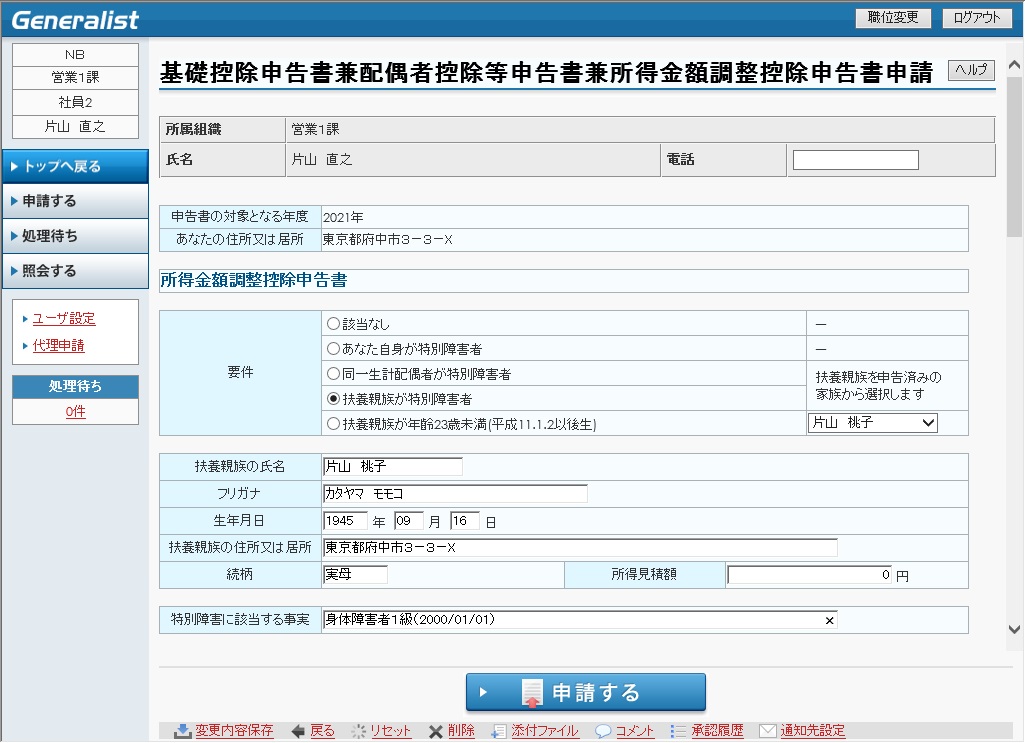 ・ 本機能での申請前に、Generalist/PRにて年末調整事前準備処理を実行し、所得金額調整控除申告書、基礎控除申告書、配偶者控除等申告書の出力に必要なテーブルをワークフローインタフェースサブシステムにて公開している場合、本機能での申請時にGeneralist/PRで作成したデータを初期表示します。