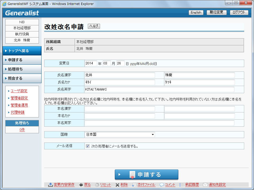 ・ 最終承認された申請内容はGeneralist/HR/PRの基本情報、旧姓情報、国籍情報に登録されます。
