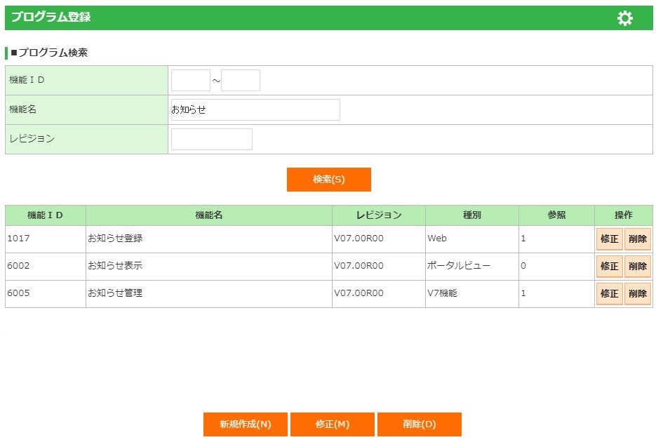 ・ 一覧で任意の行を選択後、画面下の「修正(M)」を押下すると、選択した機能情報の修正用の情報入力画面を表示します。